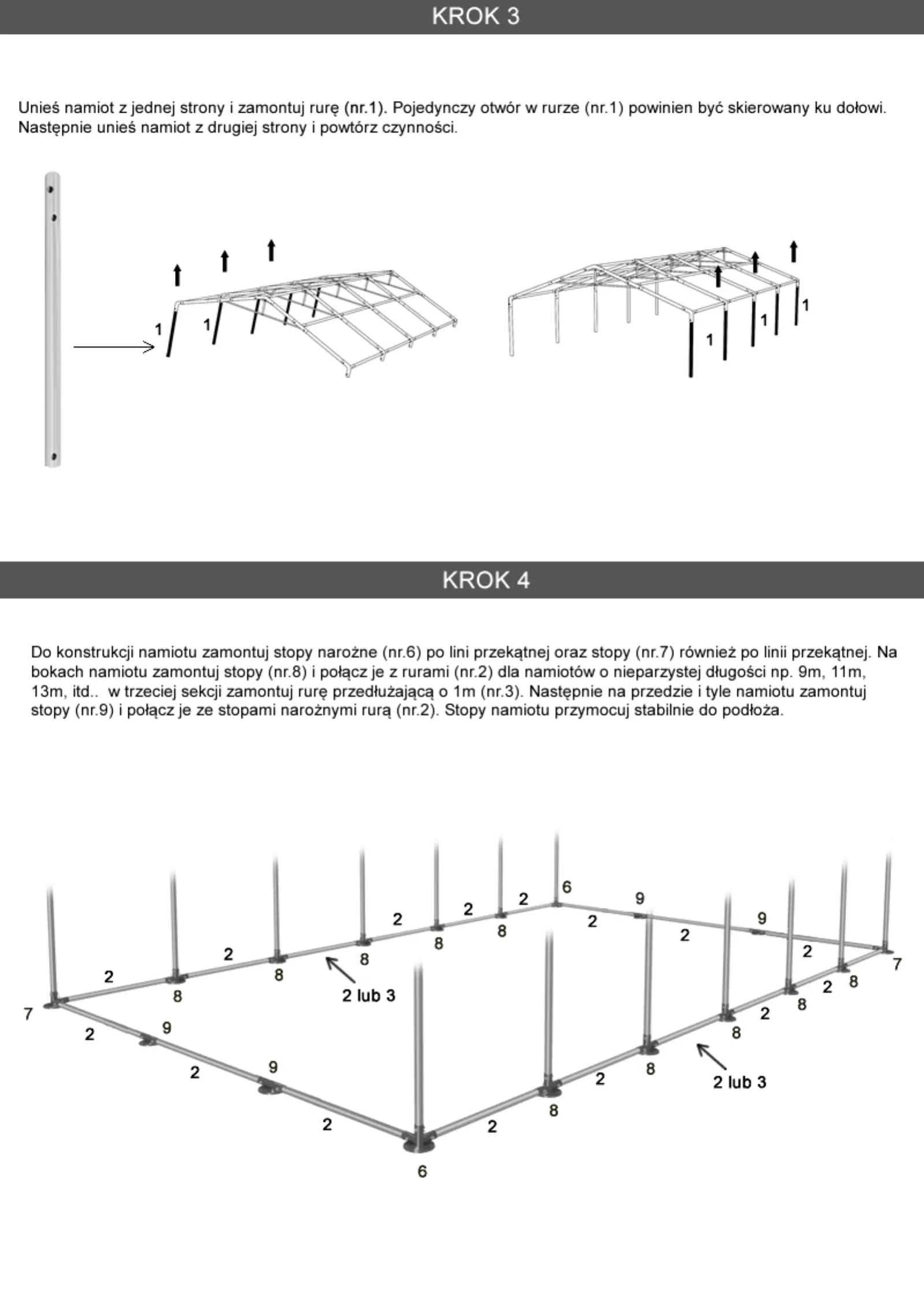bokach namiotu zamontuj stopy (nr.8) i połącz je z rurami (nr.2) dla namiotów o nieparzystej długości np. 9m, 11m,