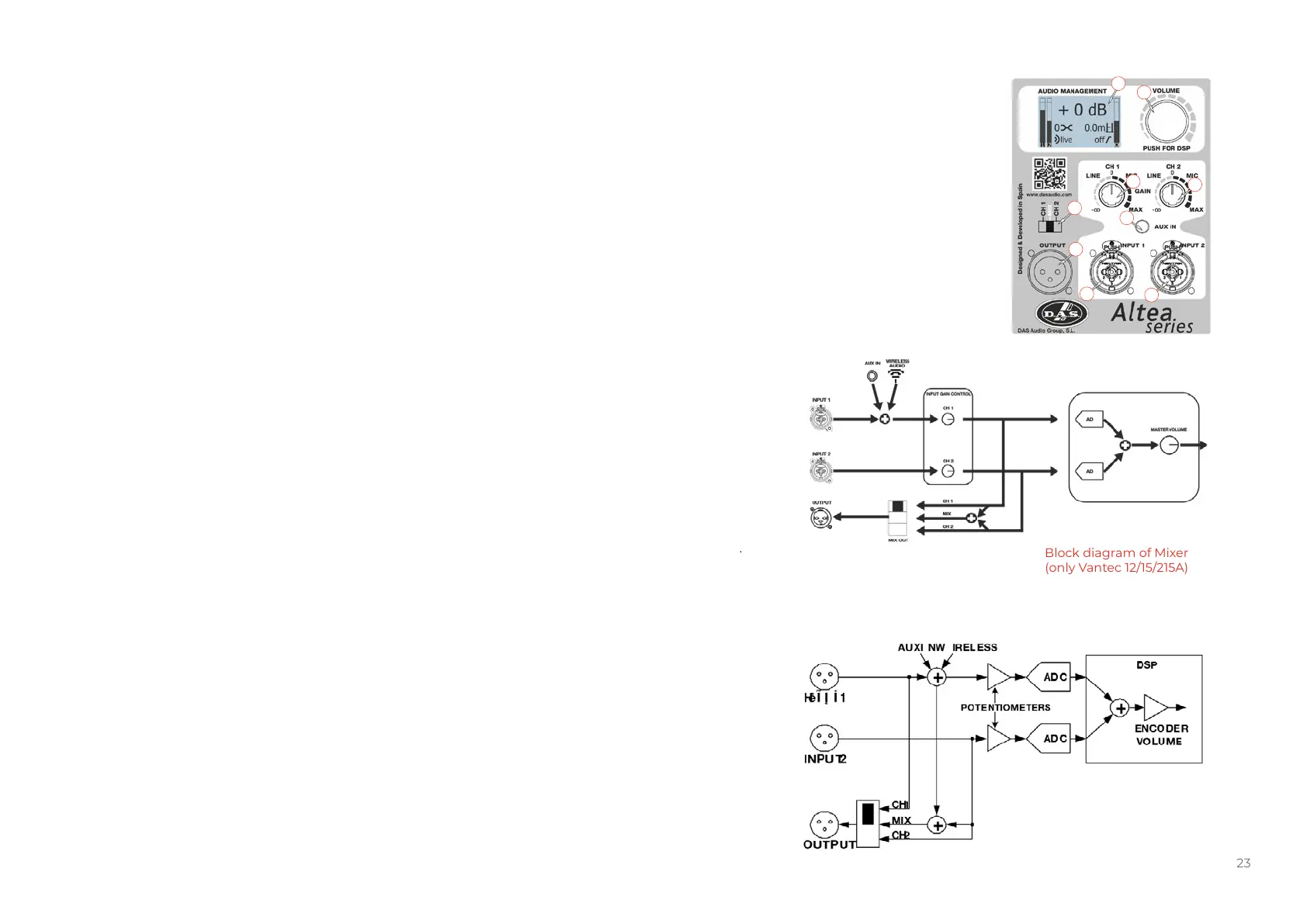 Use the encoder to select the desired output volume and push/hold it to access to the different DSP and cabinet