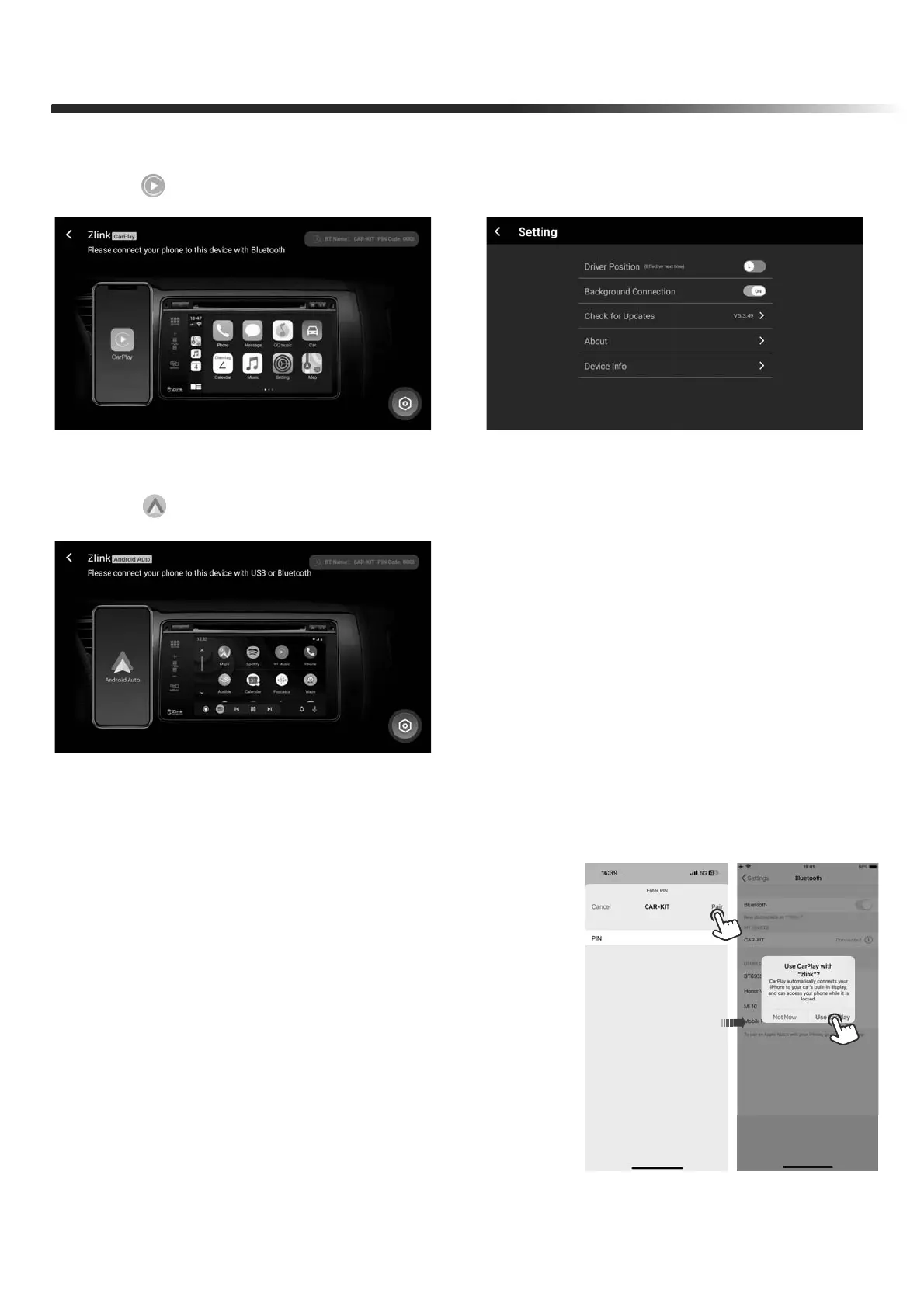 default PIN “0000” and pair it, then Agree “Use CarPlay”.