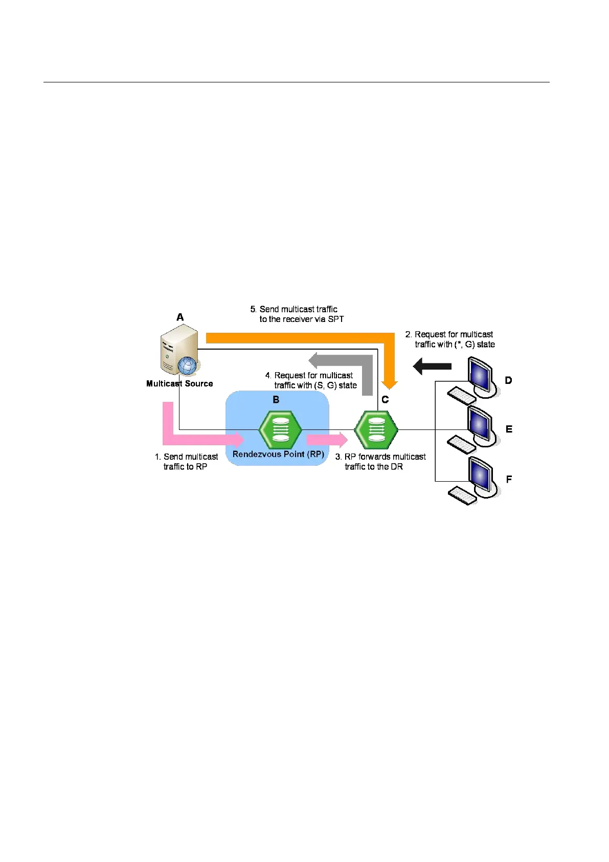 the source and receiver. The source A then sends the multicast traffic to the receiver D