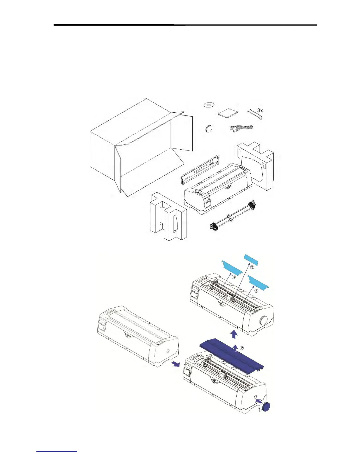 Besides this manual, the package will contain: a power cord, a ribbon cartridge, a tractor, a CD
