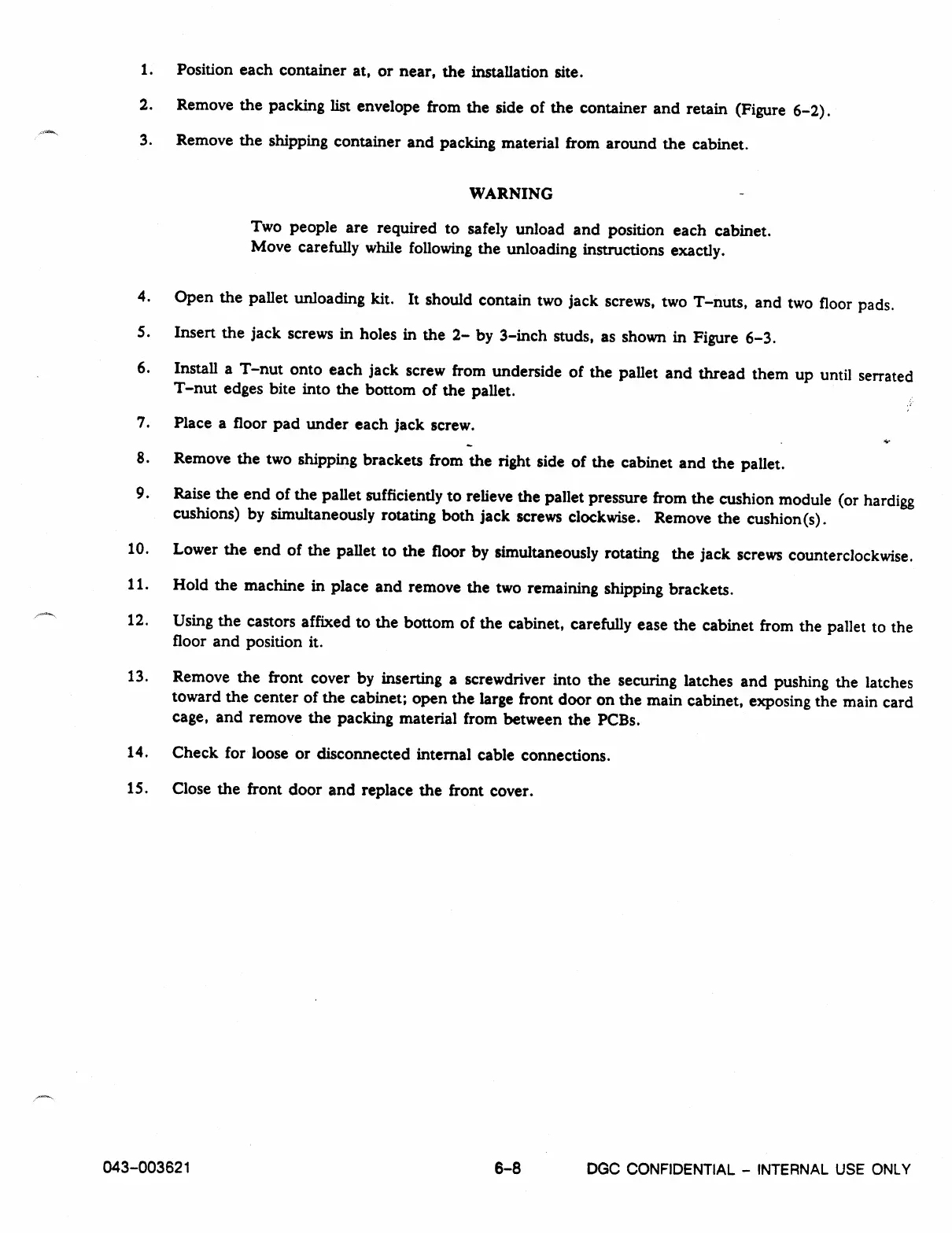 Lower the end of the pallet to the floor by simultaneously rotating the jack screws counterclockwise.