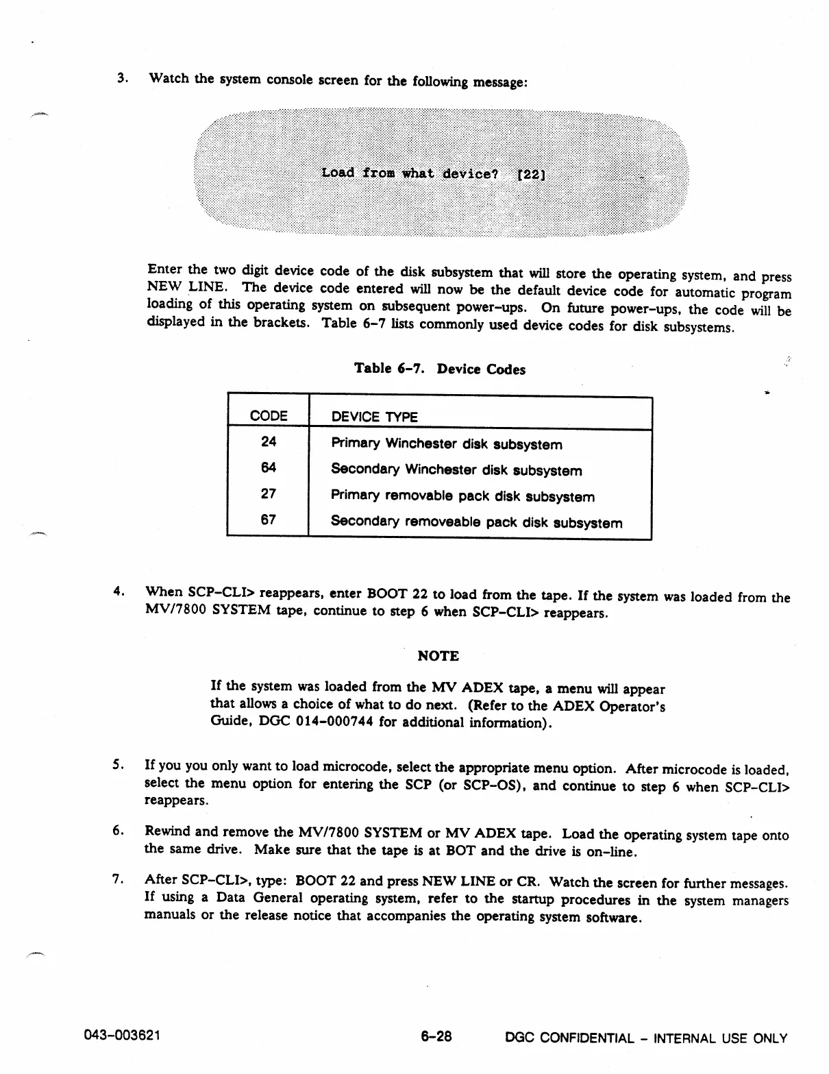 Rewind and remove the MV/7800 SYSTEM or MV ADEX tape. Load the operating system tape onto