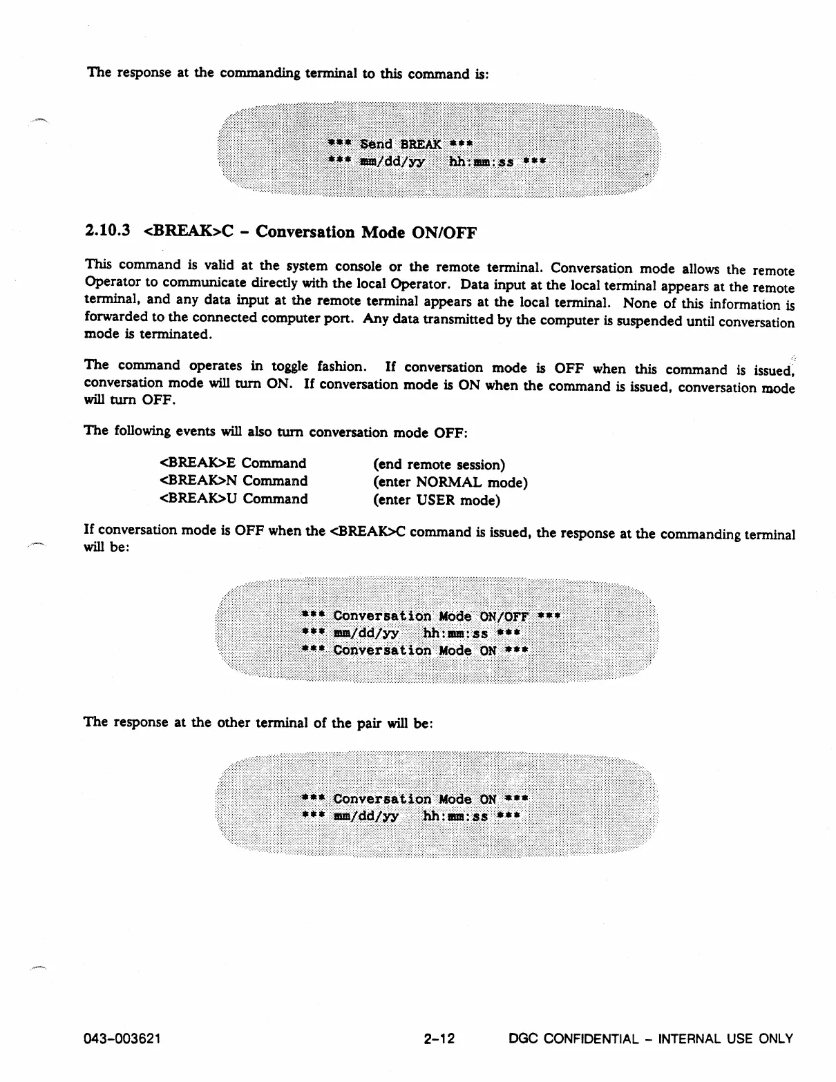 If conversation mode is OFF when the <BREAK>C command is issued, the response at the commanding terminal