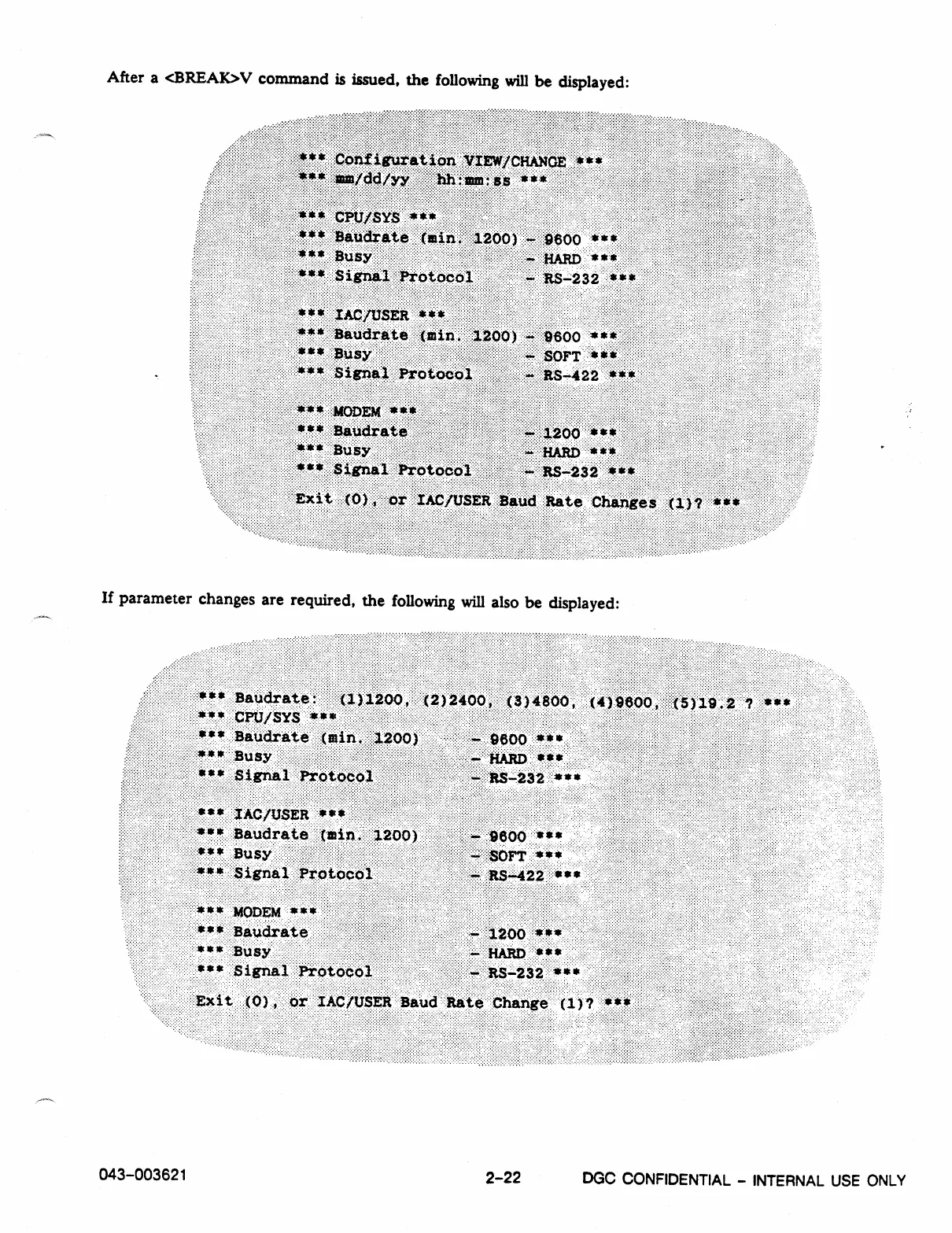 After a <BREAK>V command is issued, the following will be displayed: