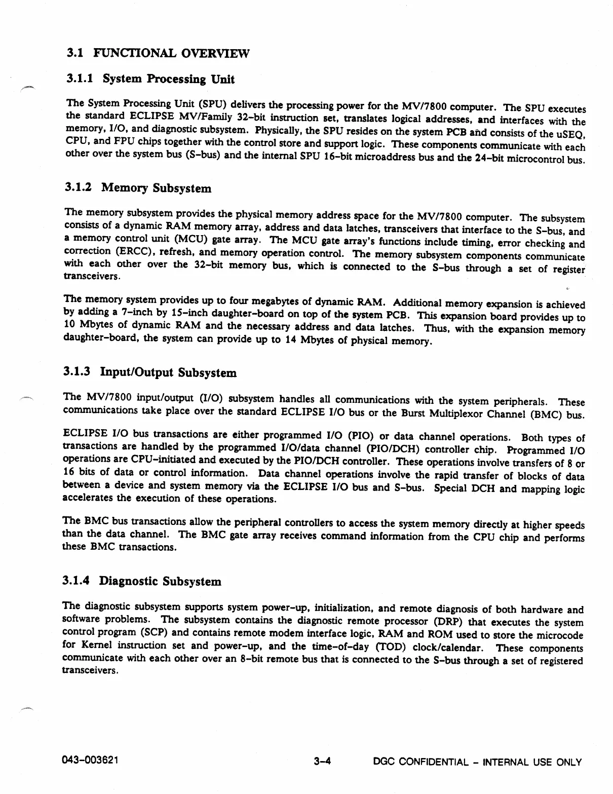The memory subsystem provides the physical memory address space for the MV/7800 computer. The subsystem
