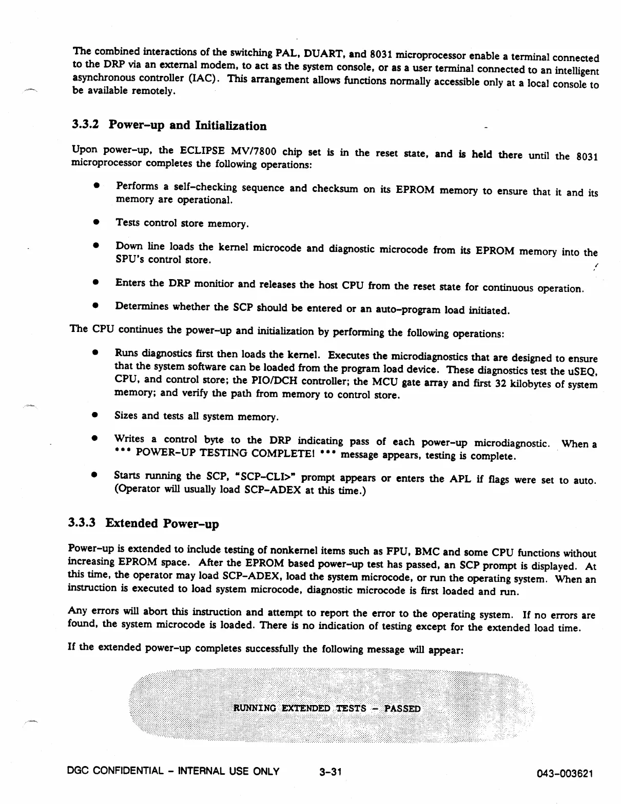 Upon power-up, the ECLIPSE MV/7800 chip set is in the reset state, and is held there until the 8031