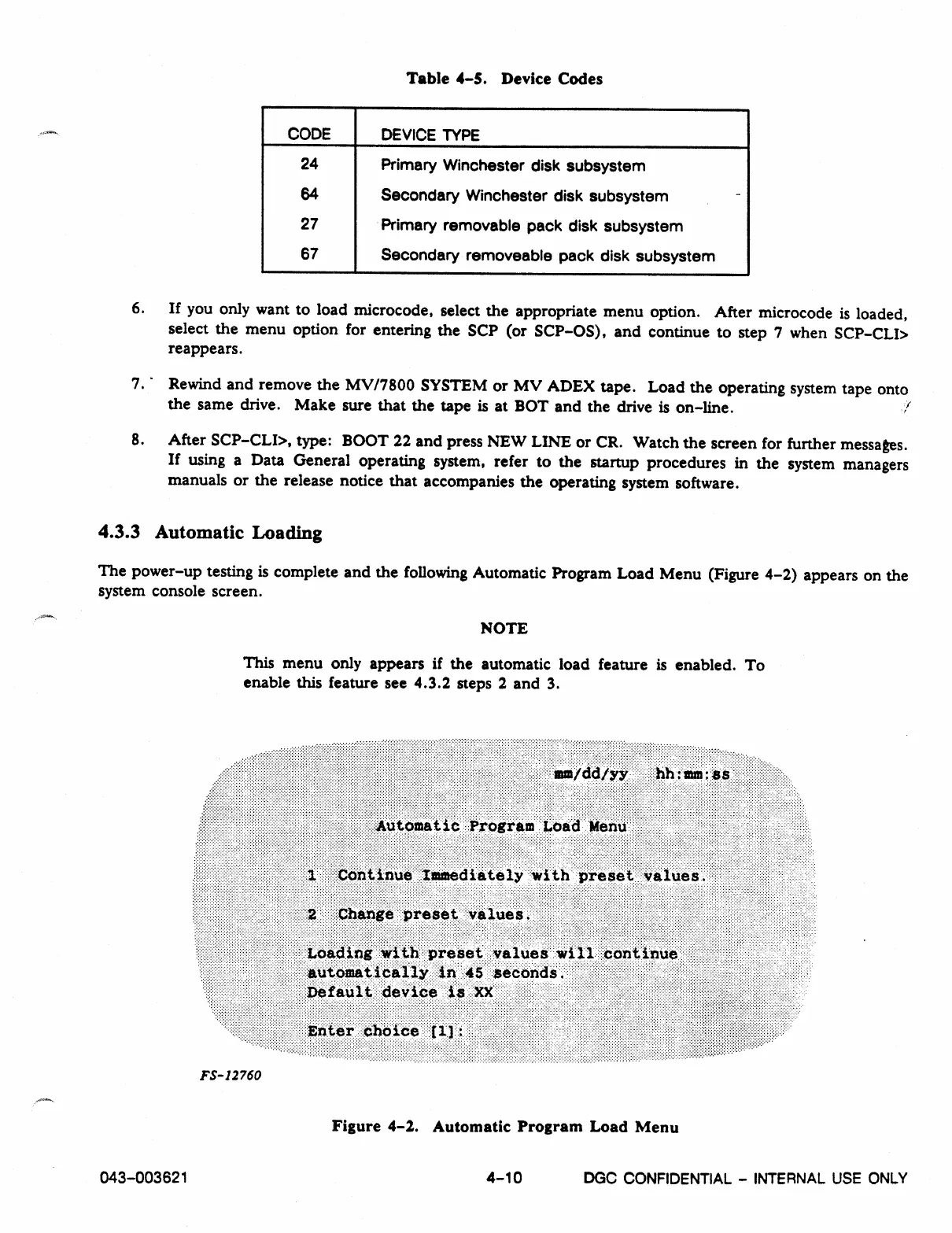 The power-up testing is complete and the following Automatic Program Load Menu (Figure 4-2) appears on the