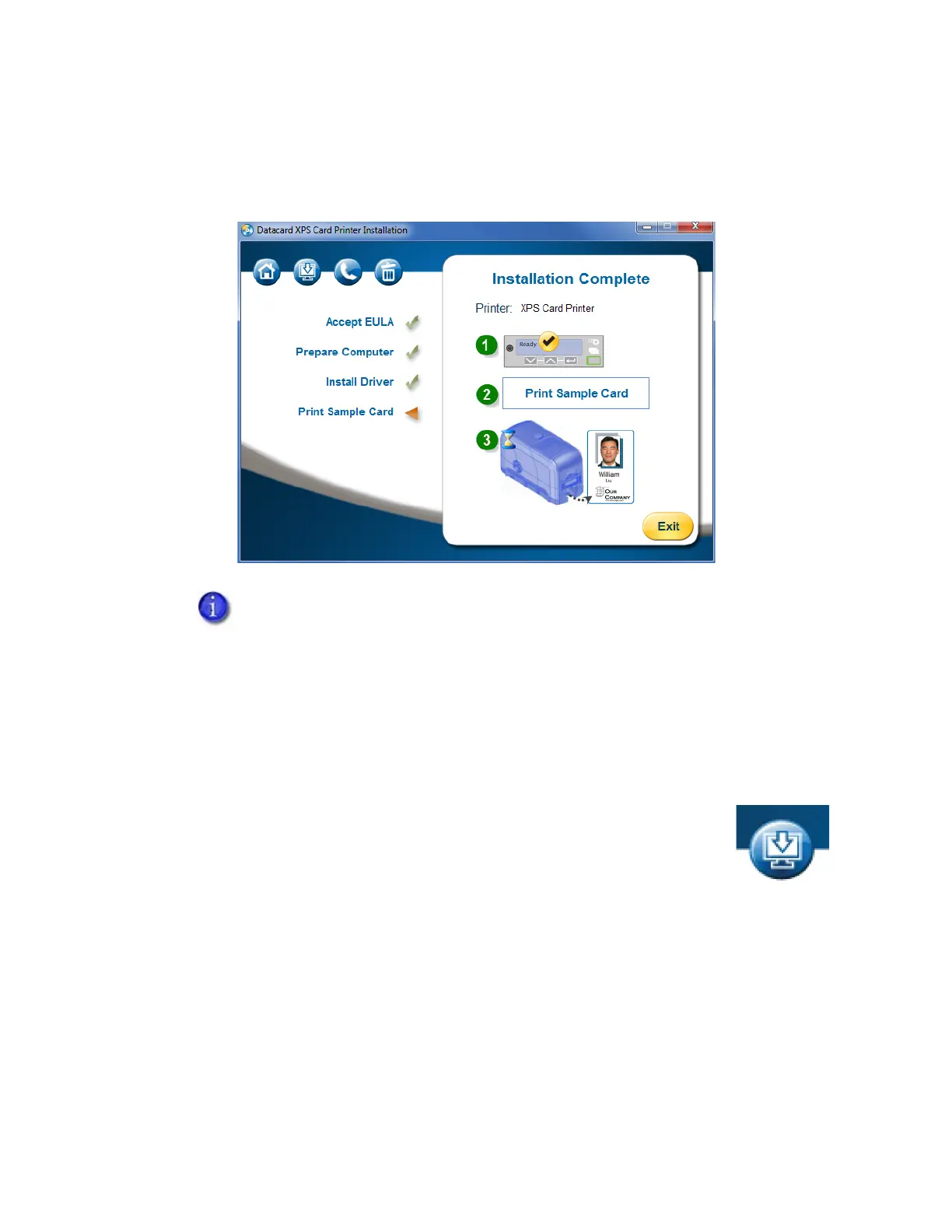 9. When the Card Printer Driver is installed, the Installation Complete page displays. Test your