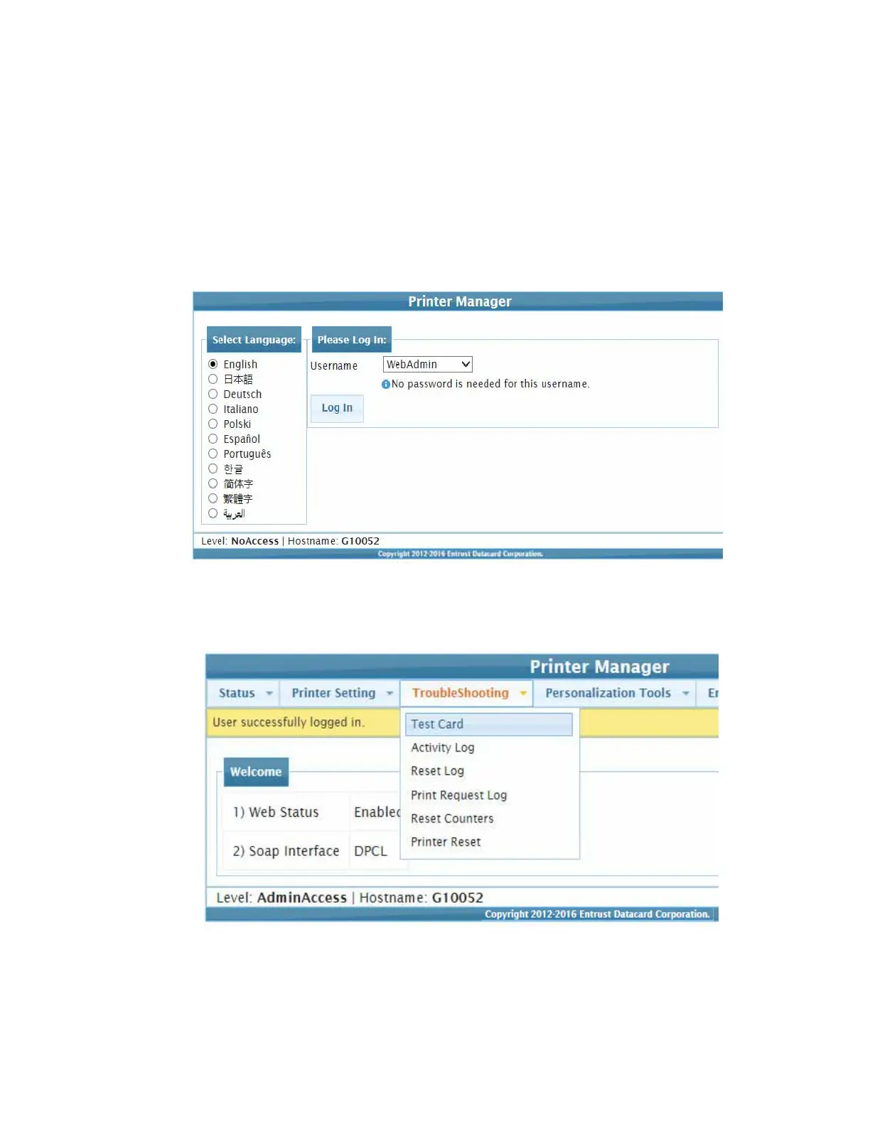 2. Select WebAdmin to log in to Printer Manager with administrative options.