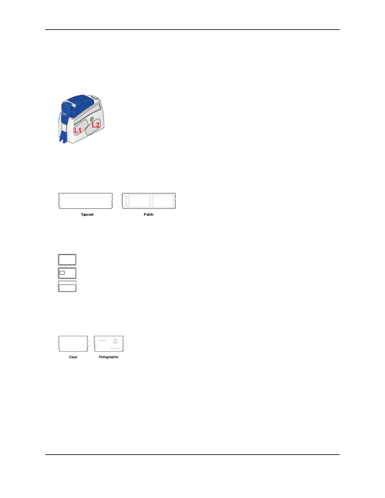 The laminator applies topcoat or DuraGard® patch material to the card. The L1 and L2 laminators can apply either