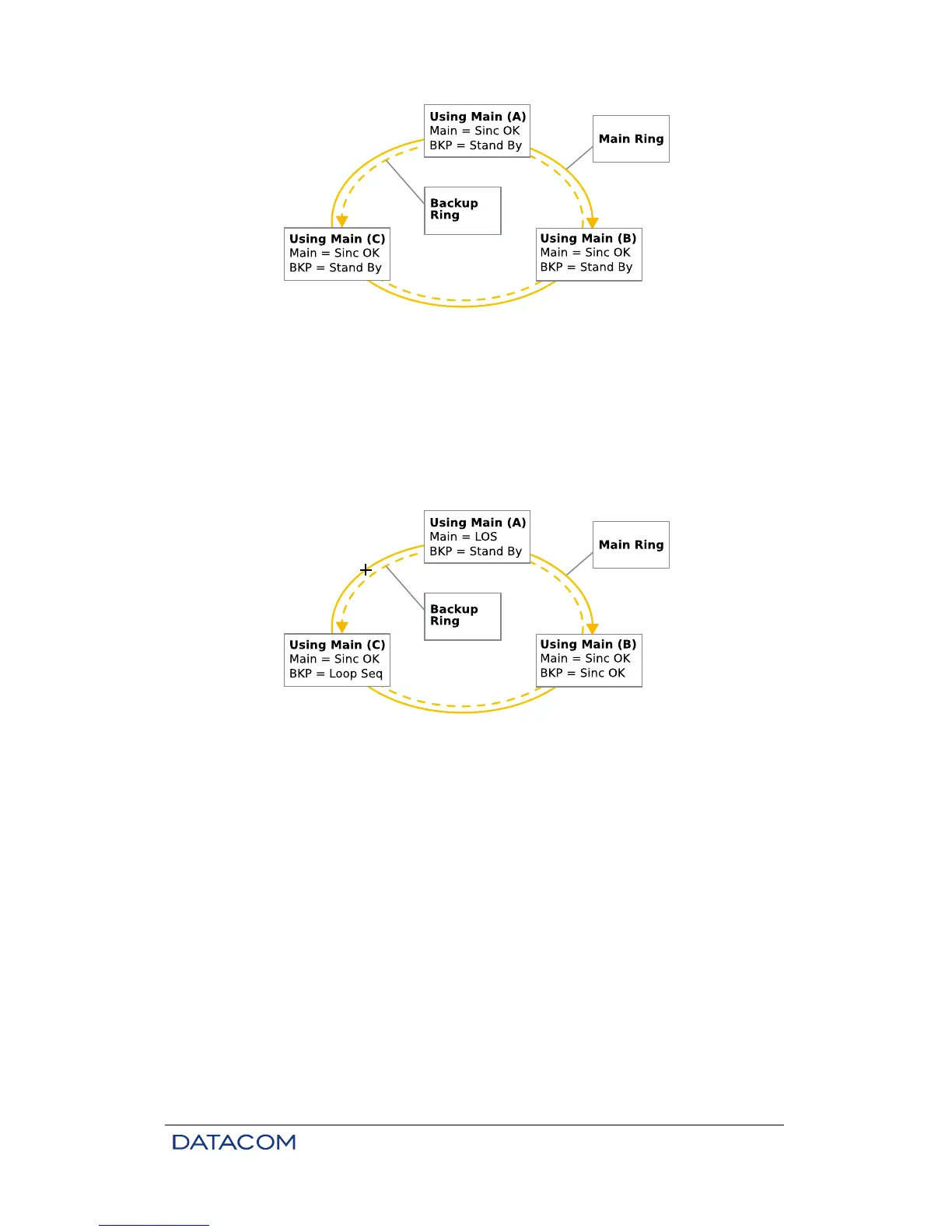 Equipment A: The Main card goes into LOS status; requests backup (Loop Seq) from equipment C. Waits