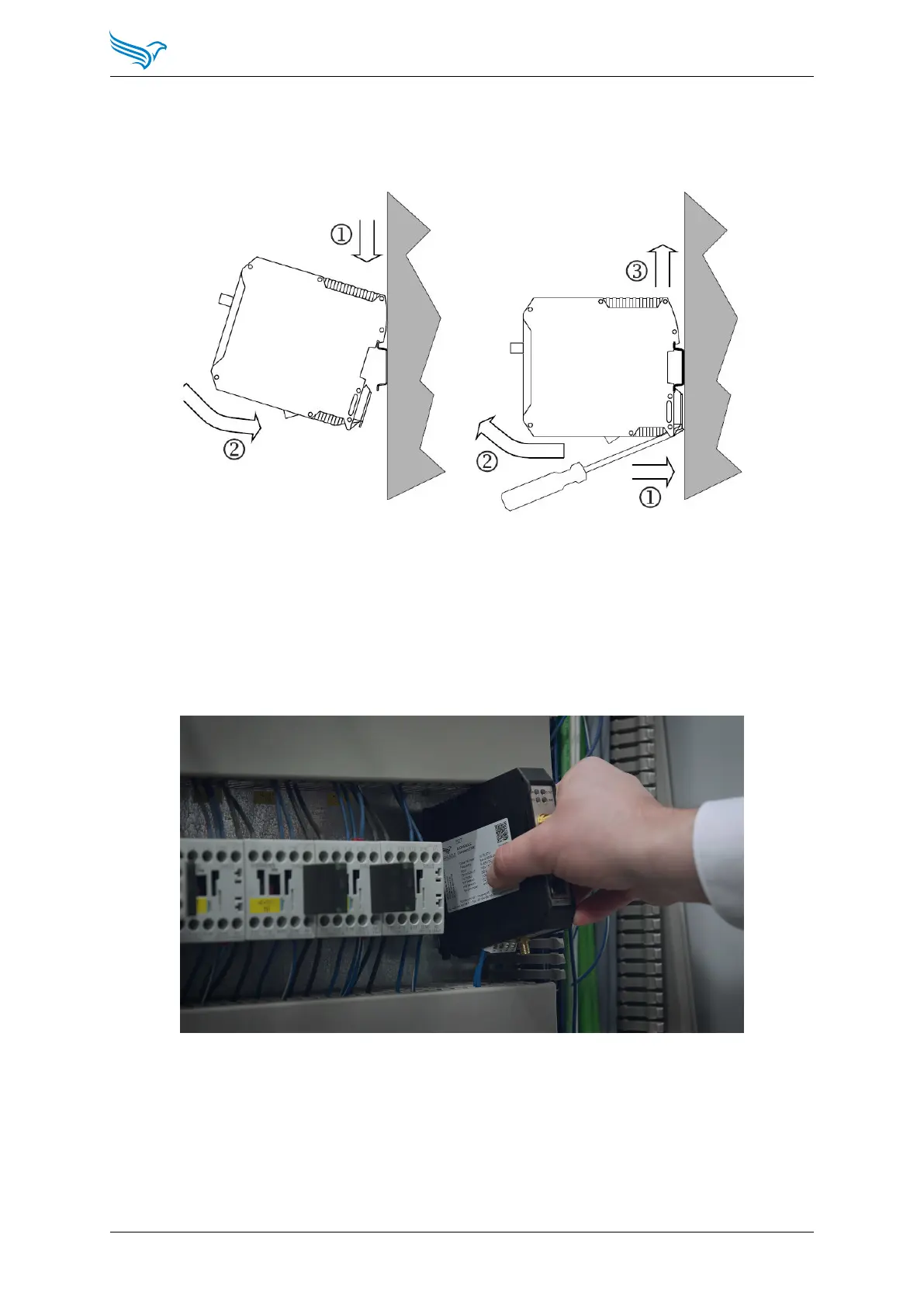 1. Place the module from diagonally above onto the top-hat rail.