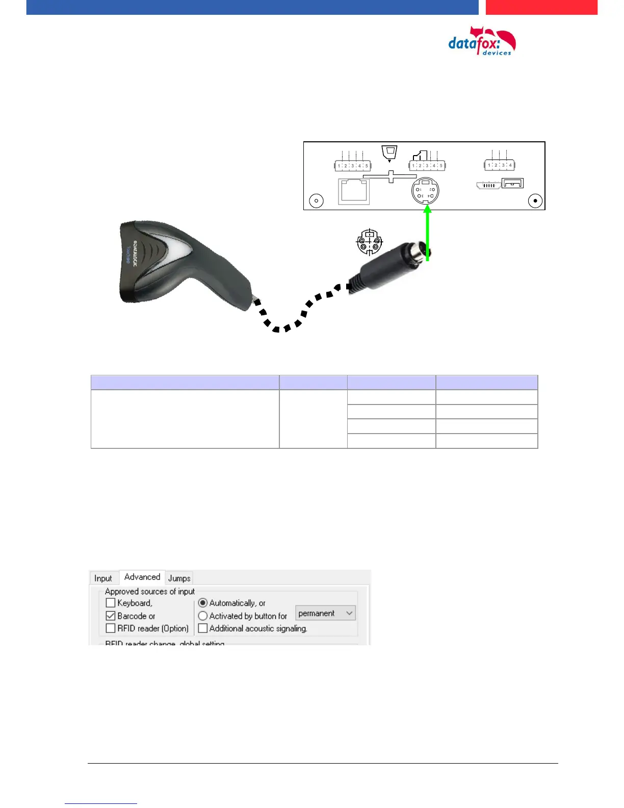 You can connect any barcode reader with a RS232 port to the EVO 3.5 Pure. Observe the following