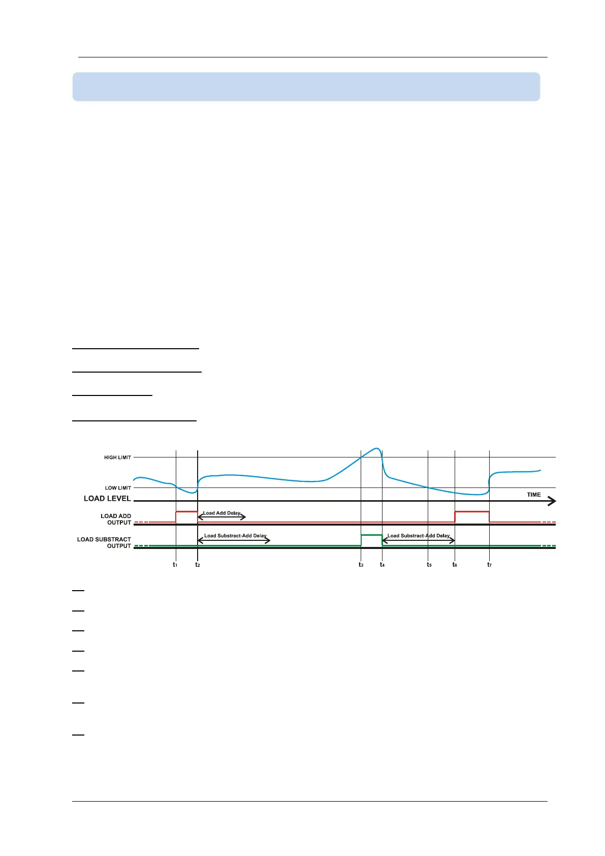 t5: the load goes below the Load Shedding Low Limit, but the Load Substract-Add delay is not expired. The