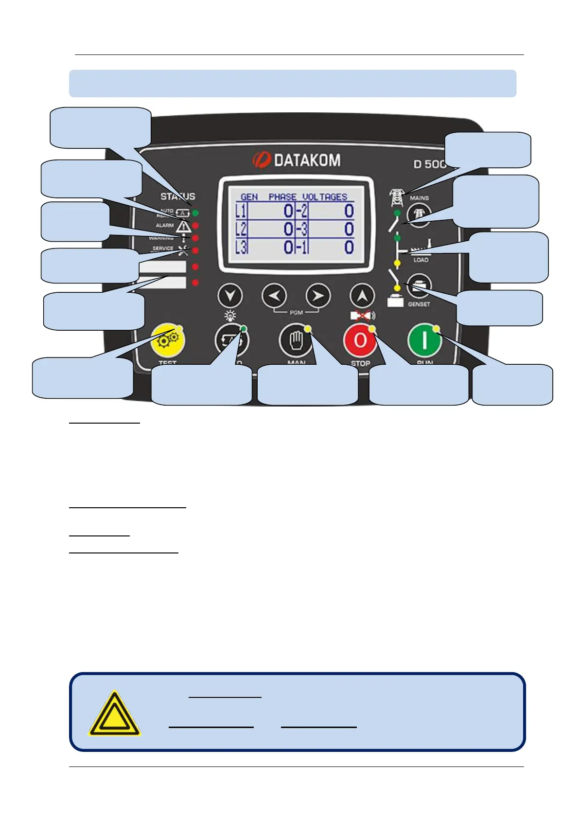 GENSET AVAILABLE: This led turns on when all genset phase voltages and the genset