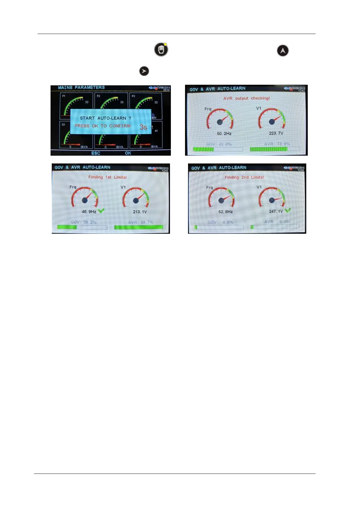 Auto learning is completed successfully. The controller will force the genset to its nominal speed and voltage.