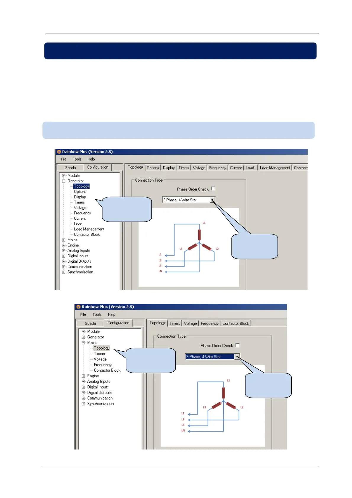 The topology is independently selectable for both genset and mains sections.