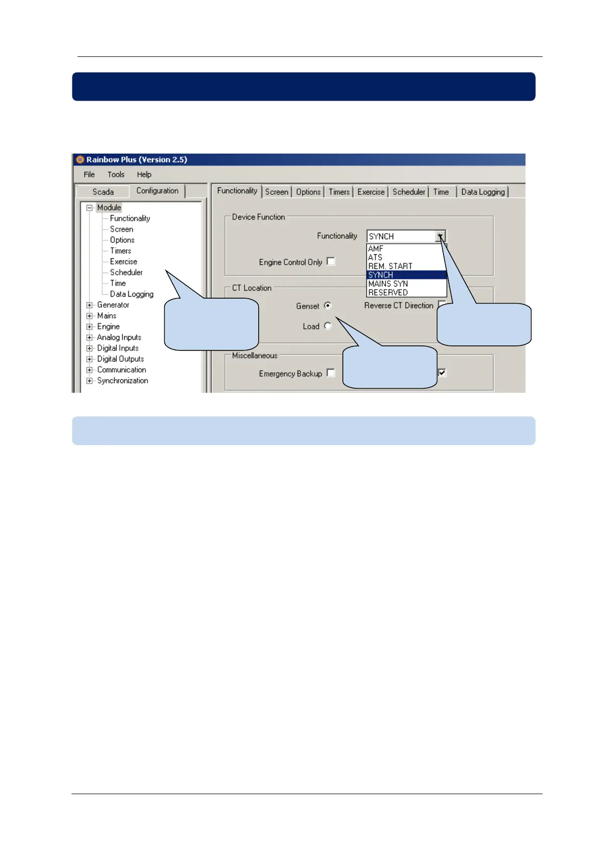 Configuration > CT Location parameter. When CTs are located at the alternator side, then mains