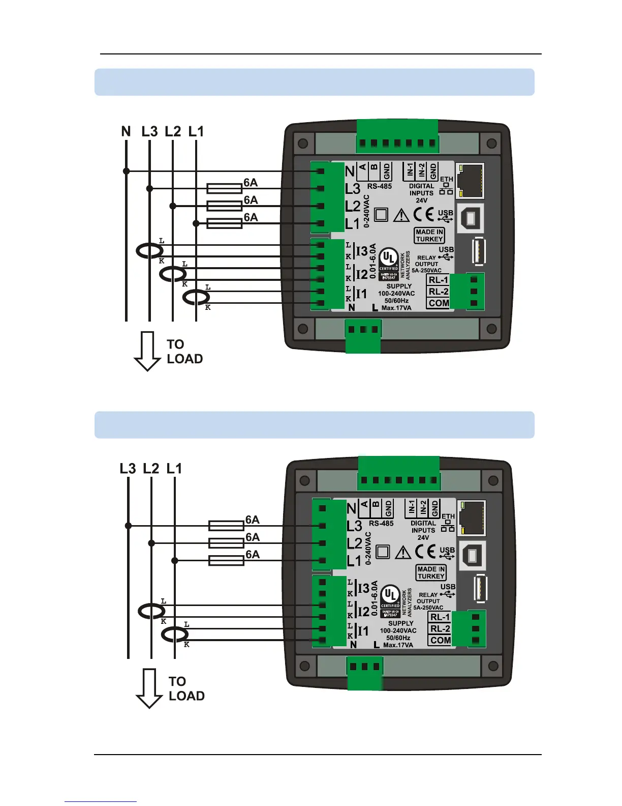 Datakom DKM-411 - Phase, 4 Wire, Delta; Phase, 3 Wire, Delta, 2 Ct (L1-L2)