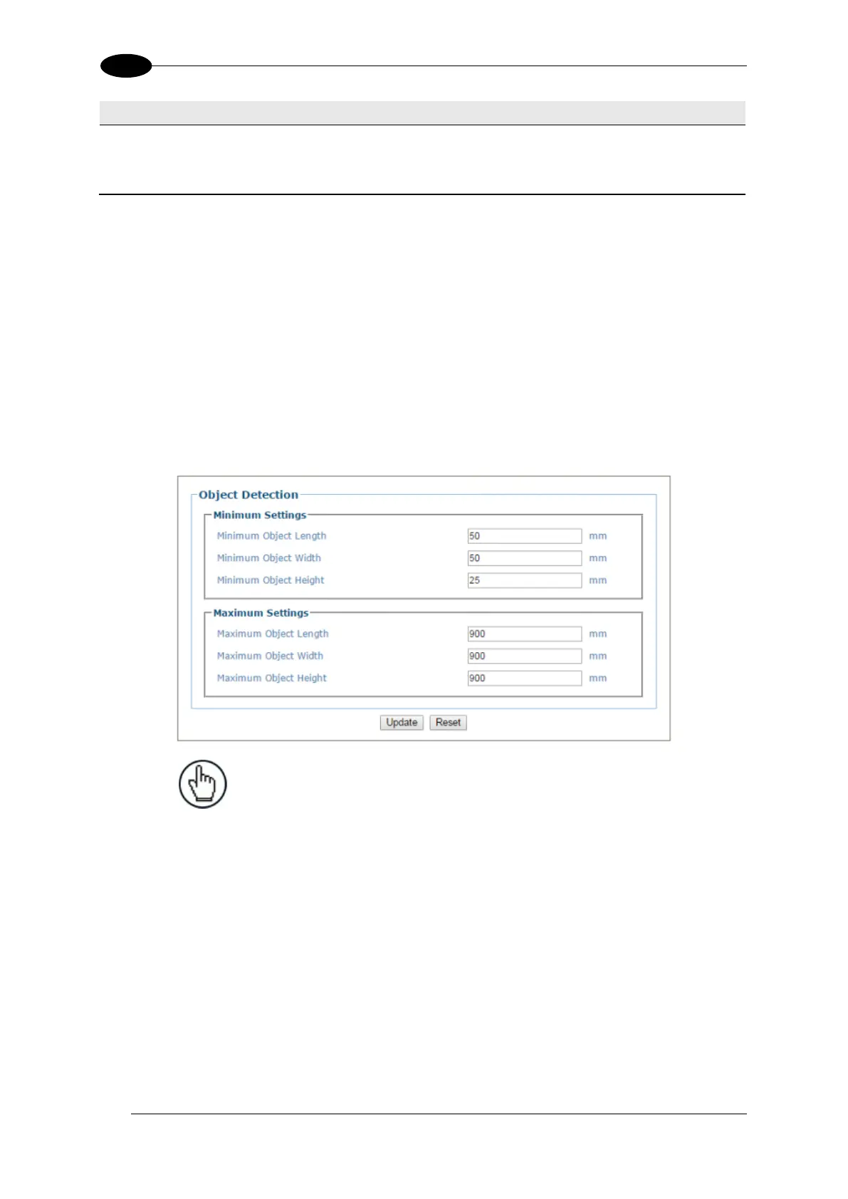 2. Enter the minimum and maximum detection size settings for object length (mm [in]),