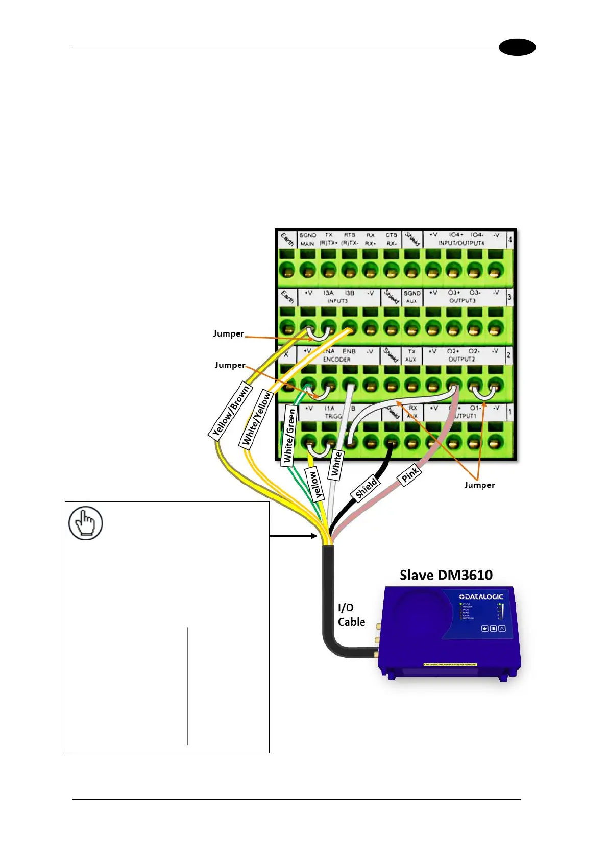 The following diagram illustrates recommended I/O wiring from slave DM3610s to the