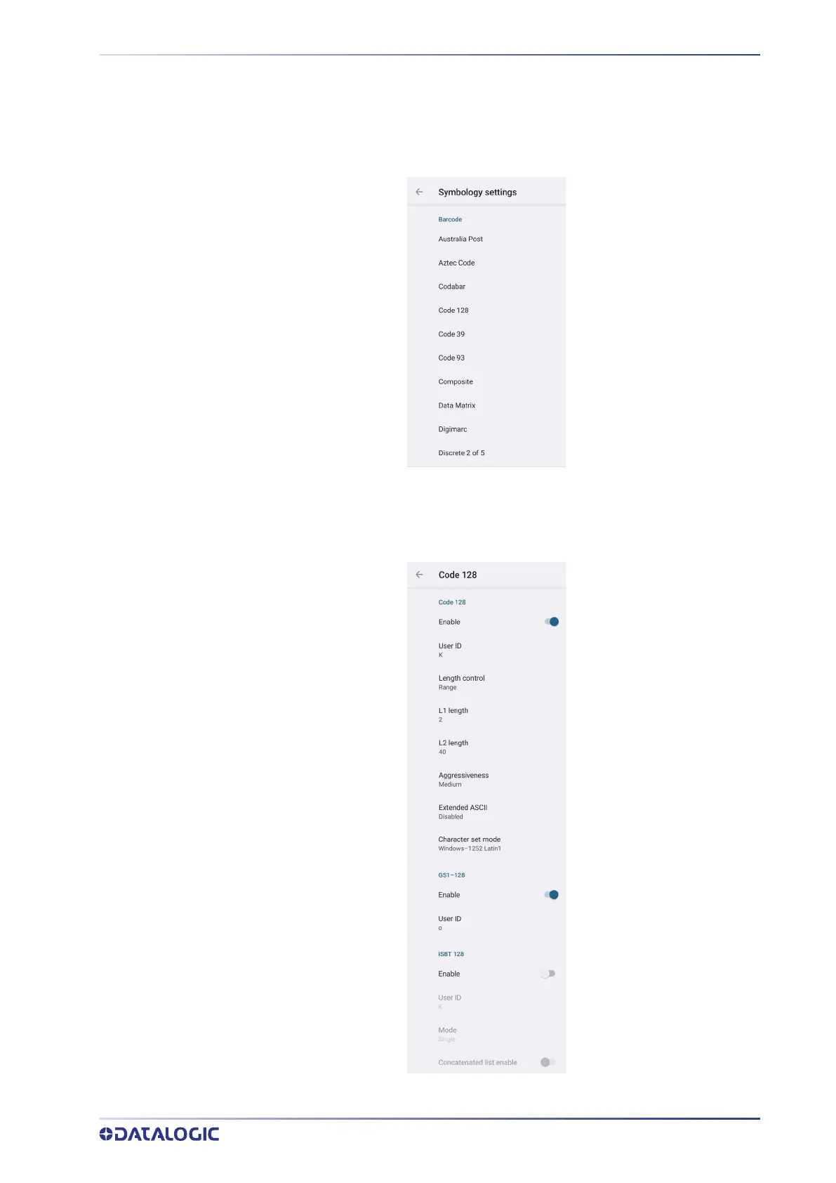 specific barcode decoding. Tap Symbology settings to configure symbology decoding