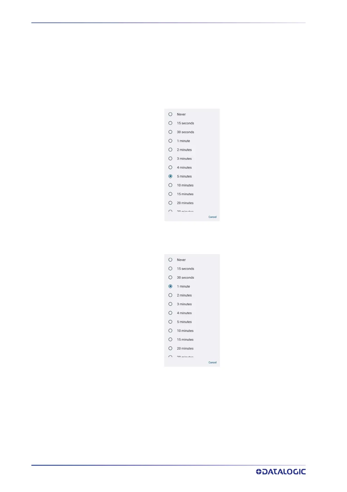 1. Tap Settings > Datalogic Settings > Power & sources: