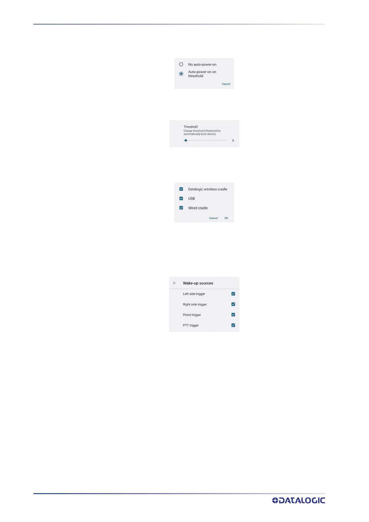 Settings > Datalogic Settings > Power & sources > Wake-up sources to enable/disable