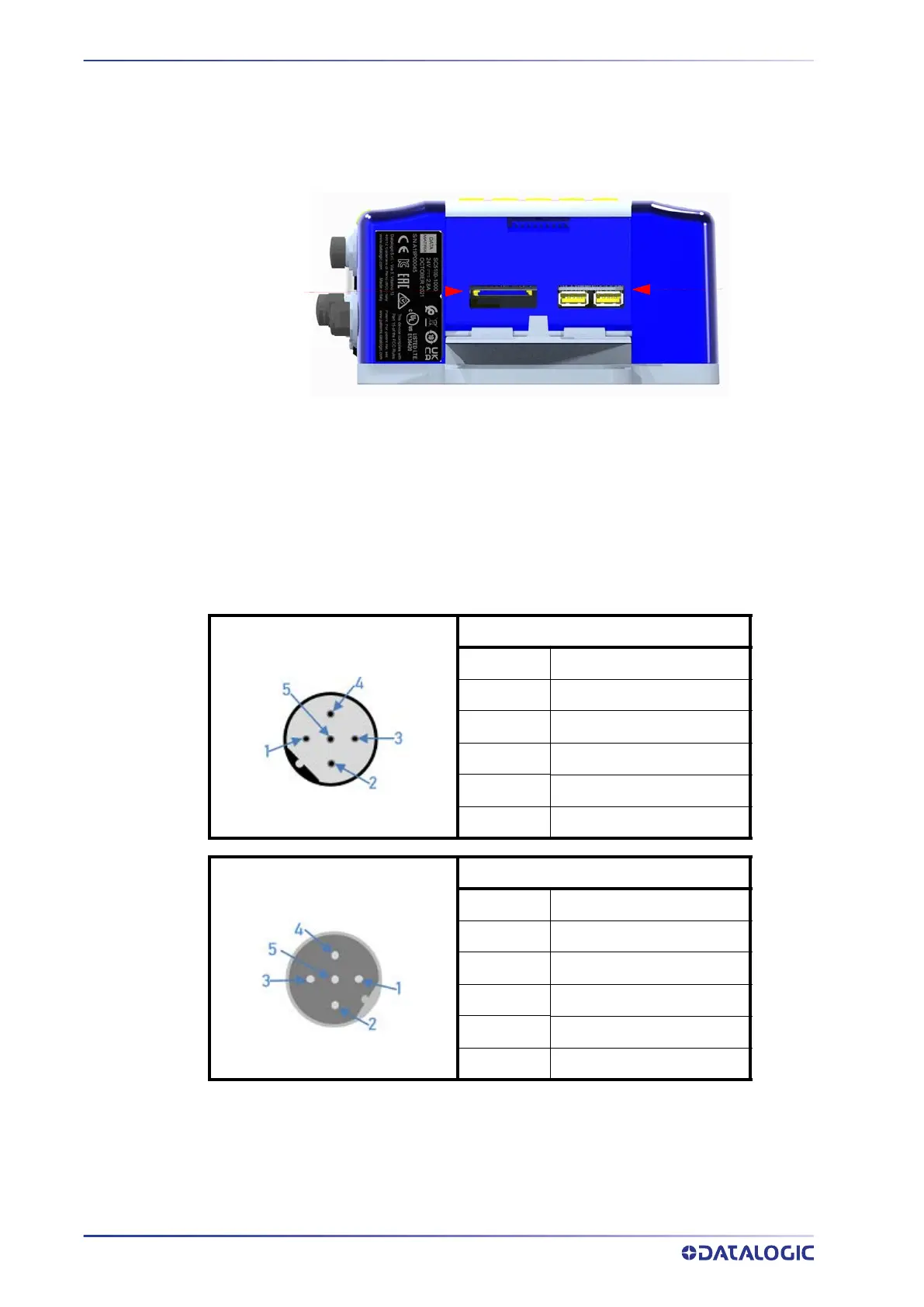 A pair of Male and Female M12 5-pin B-Coded connectors are provided on the SC5100’s