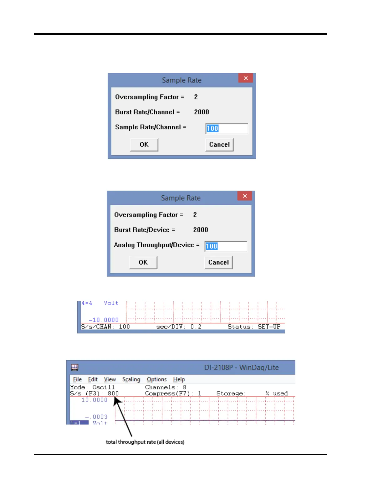 Total throughput rate is displayed in the top-left portion of the WinDaq screen at S/s (F3). For example, if two