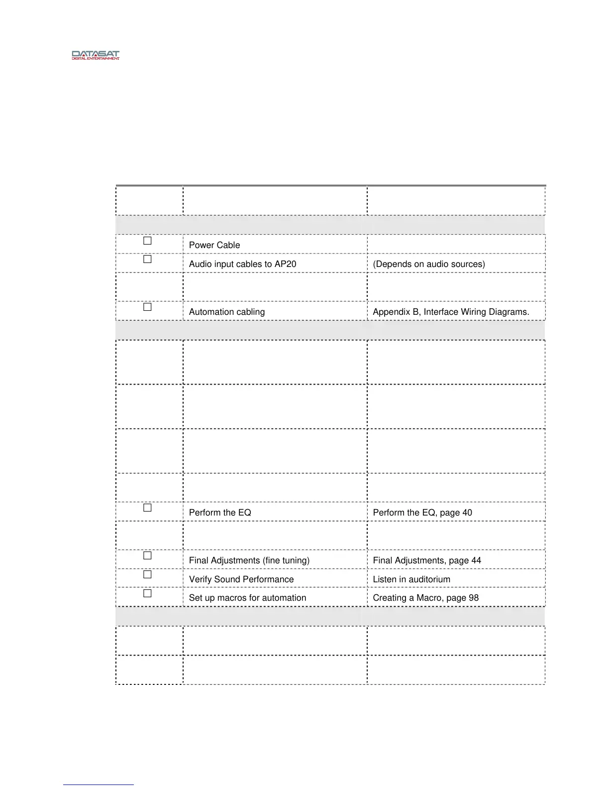 Theater Equipment Check Check speakers, amplifiers, auditorium
