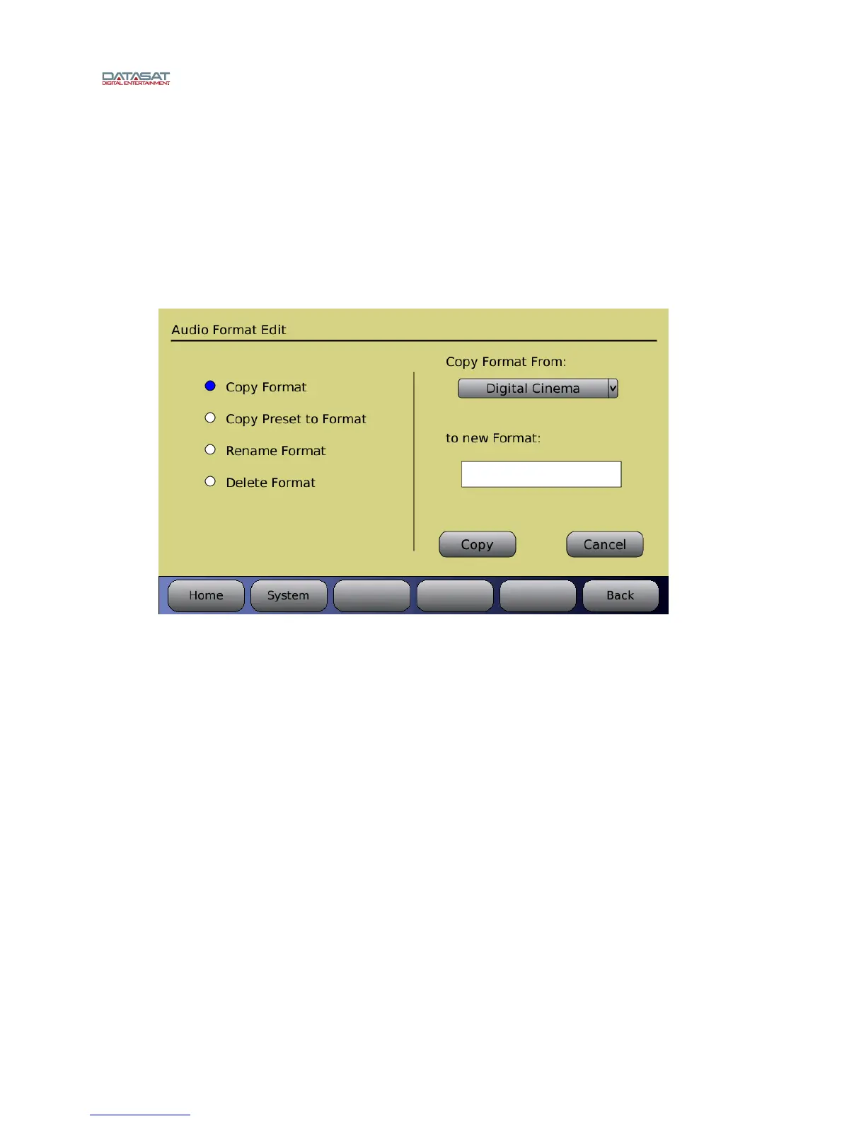 After setting up one screen (auditorium), you can copy the setup parameters including format names,