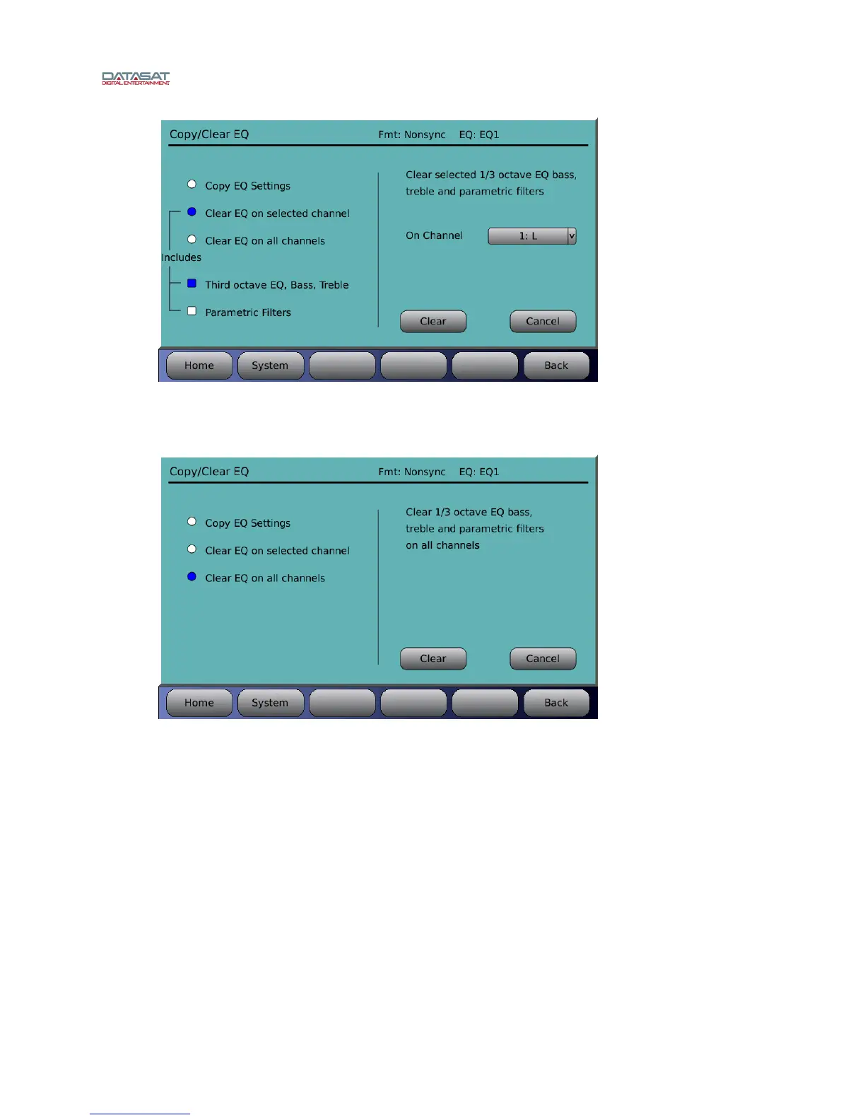 î Clear EQ on all channels clears third octave, bass, treble and parametric filters on all