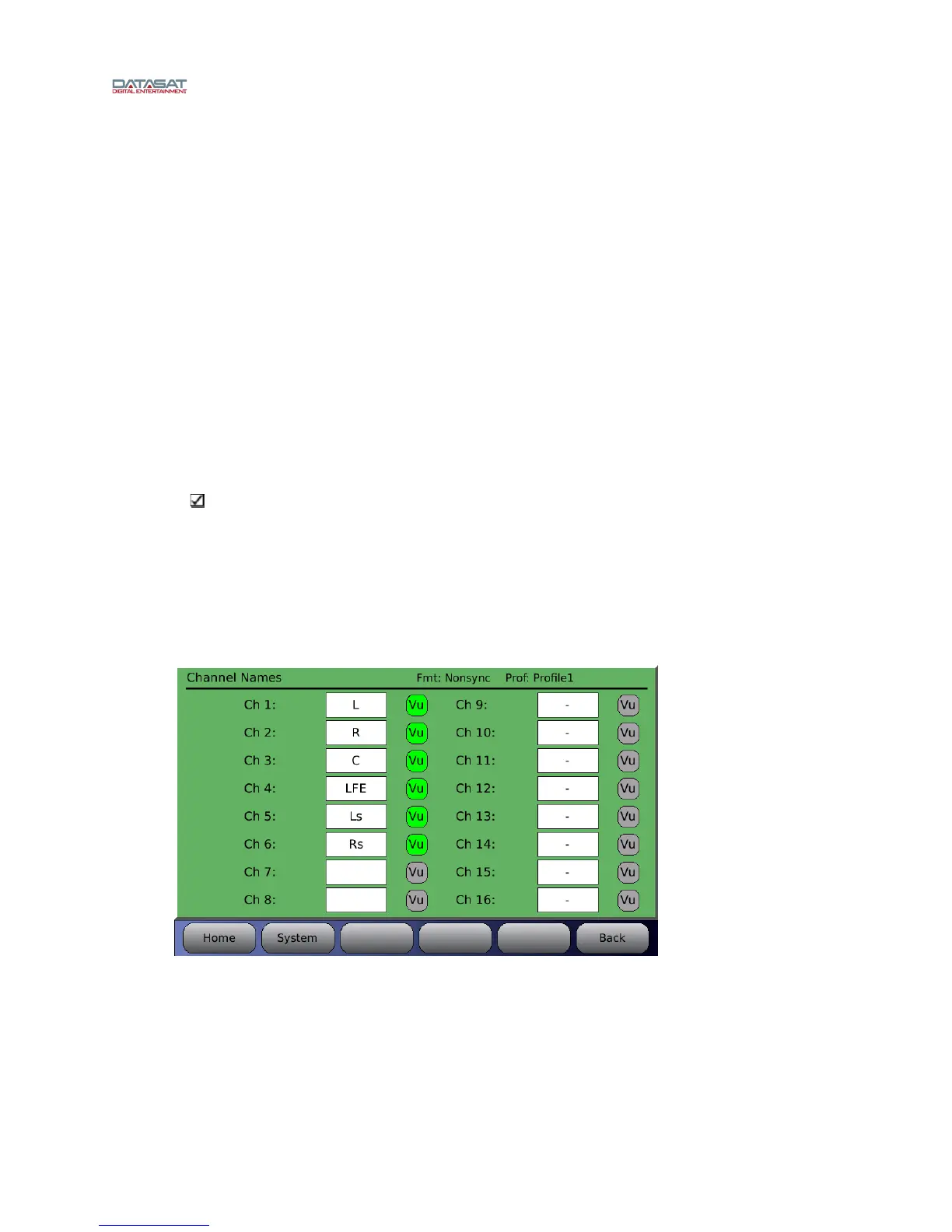 When a Vu button is highlighted green, that channel will display Vu bars on the Home screen.