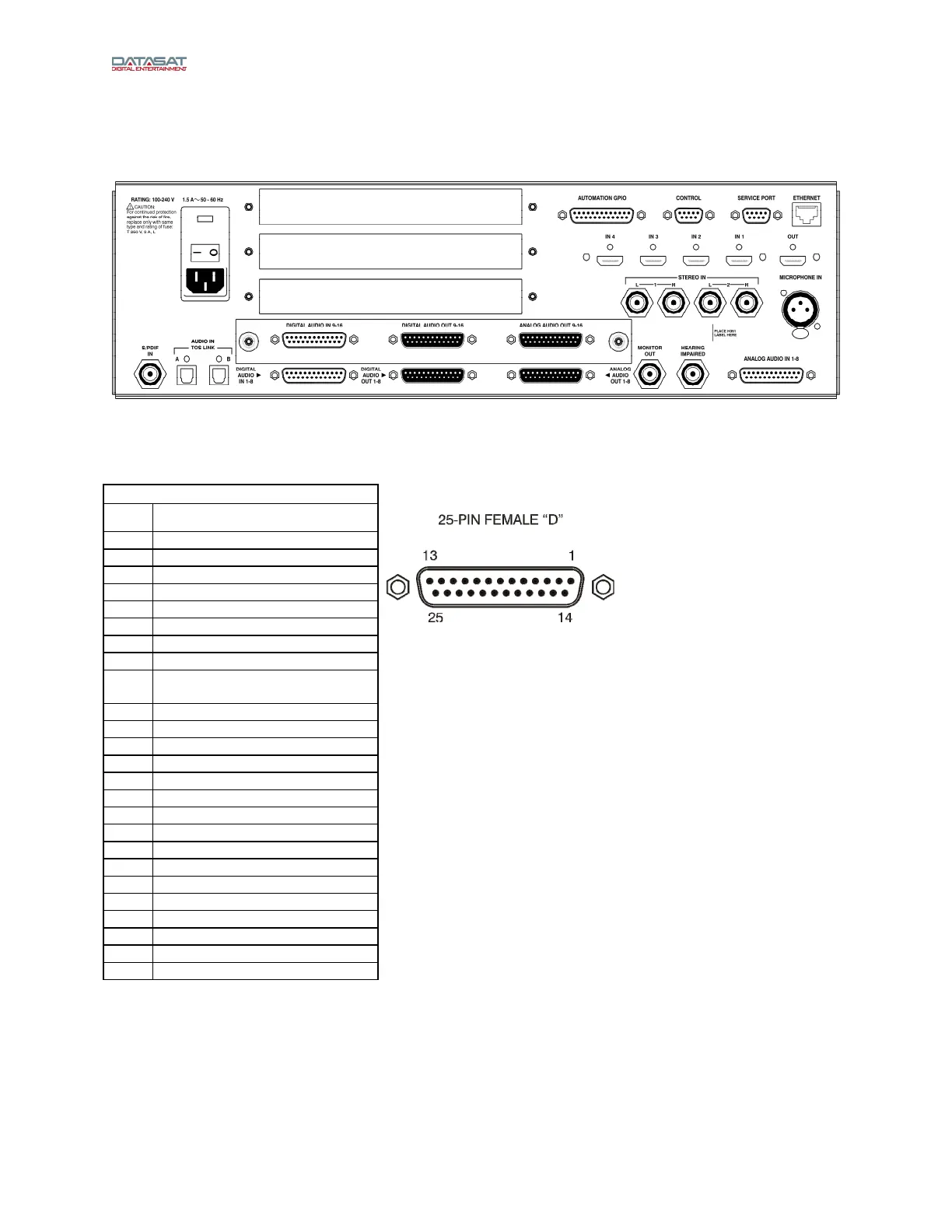 This appendix lists the pin-out of all of the connectors on the back panel of the AP25 Audio Processor.