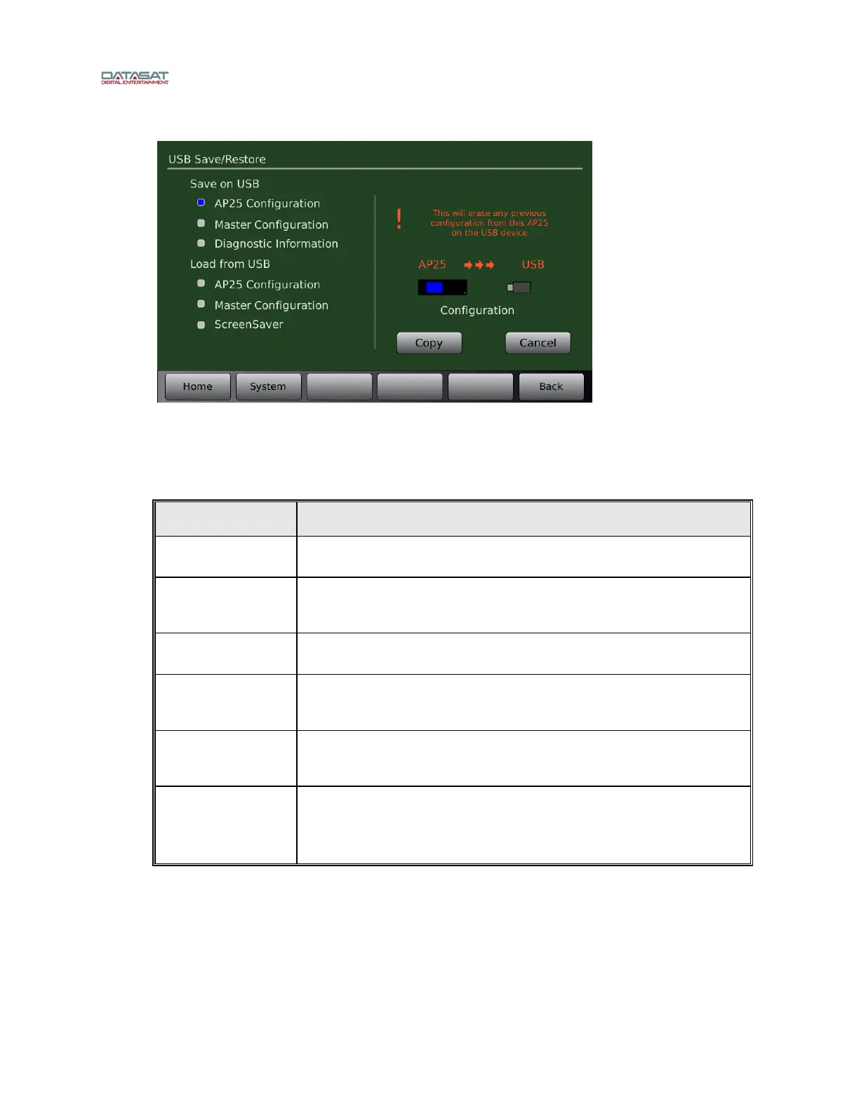 Copy AP25 configuration from a USB device to system. This will ERASE the