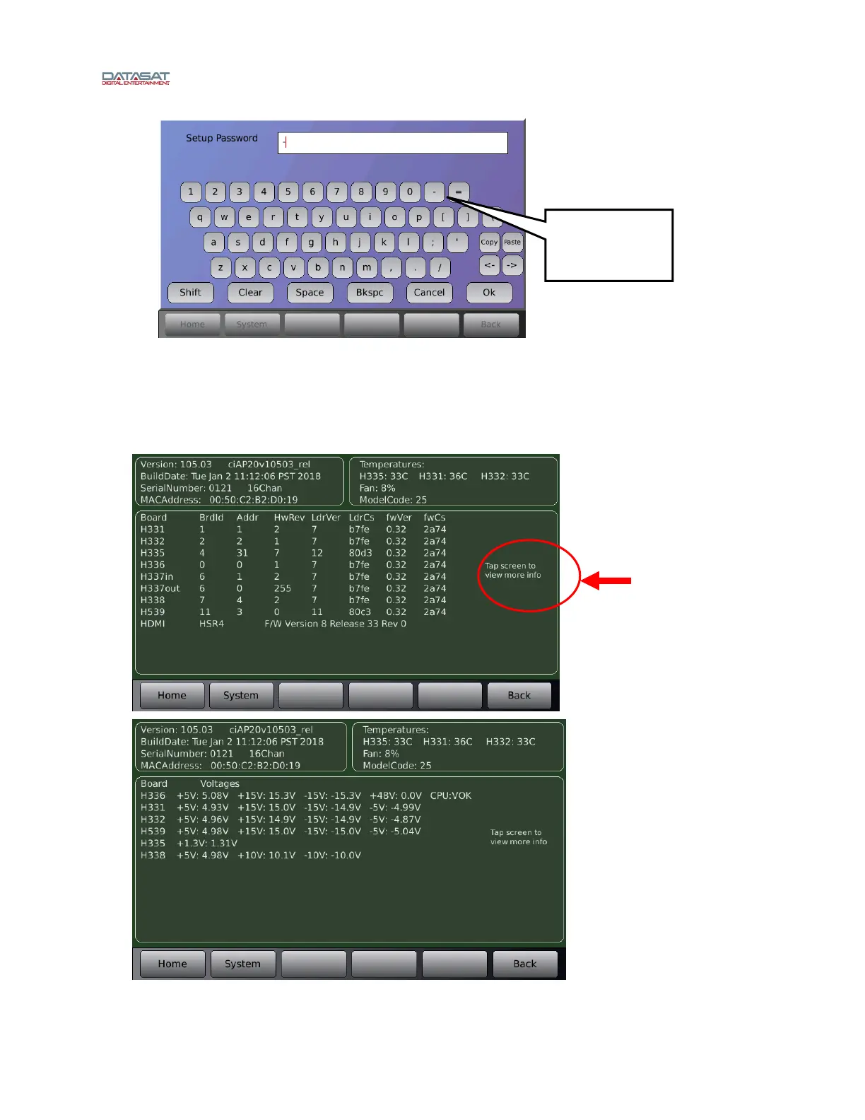 From the system Setup screen, touch the System Info button. The System Info screens are shown below.