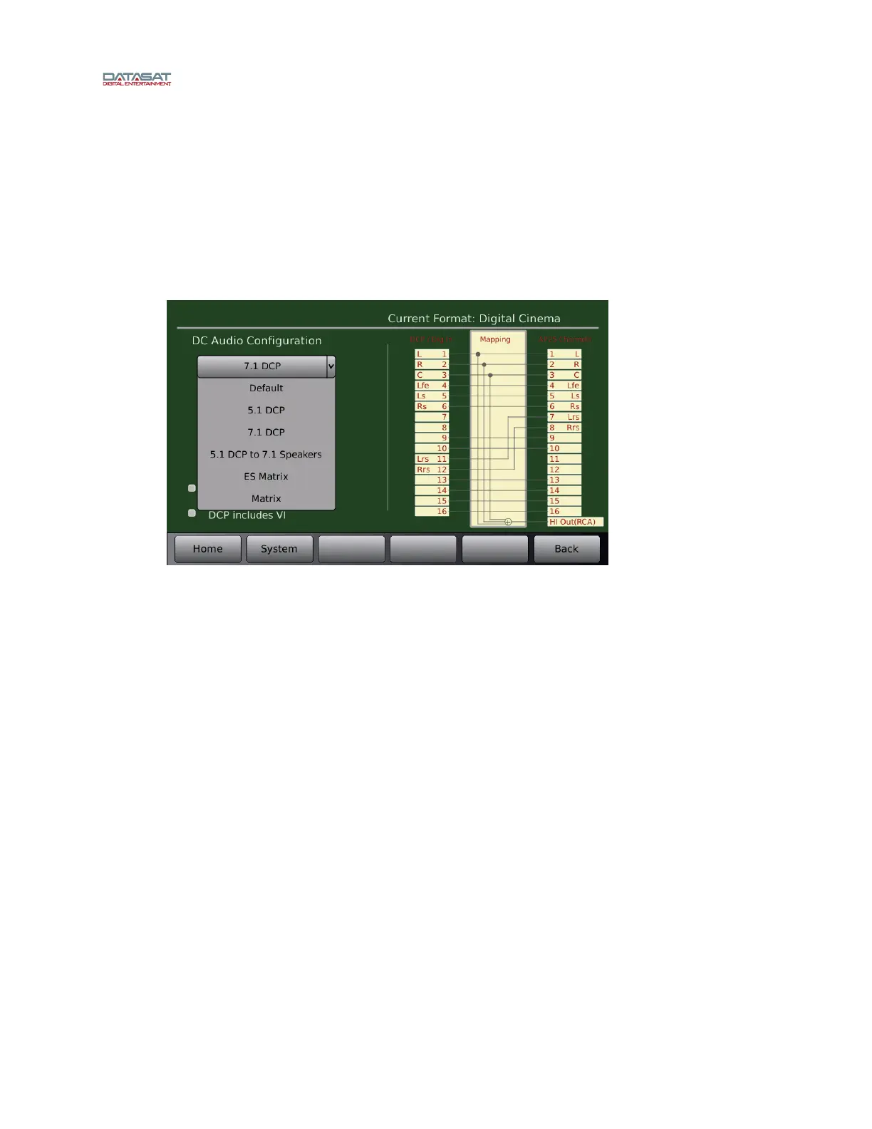 7.1 DCP – Select when playing a 7.1 DS DCP in which the left/right back surround channels