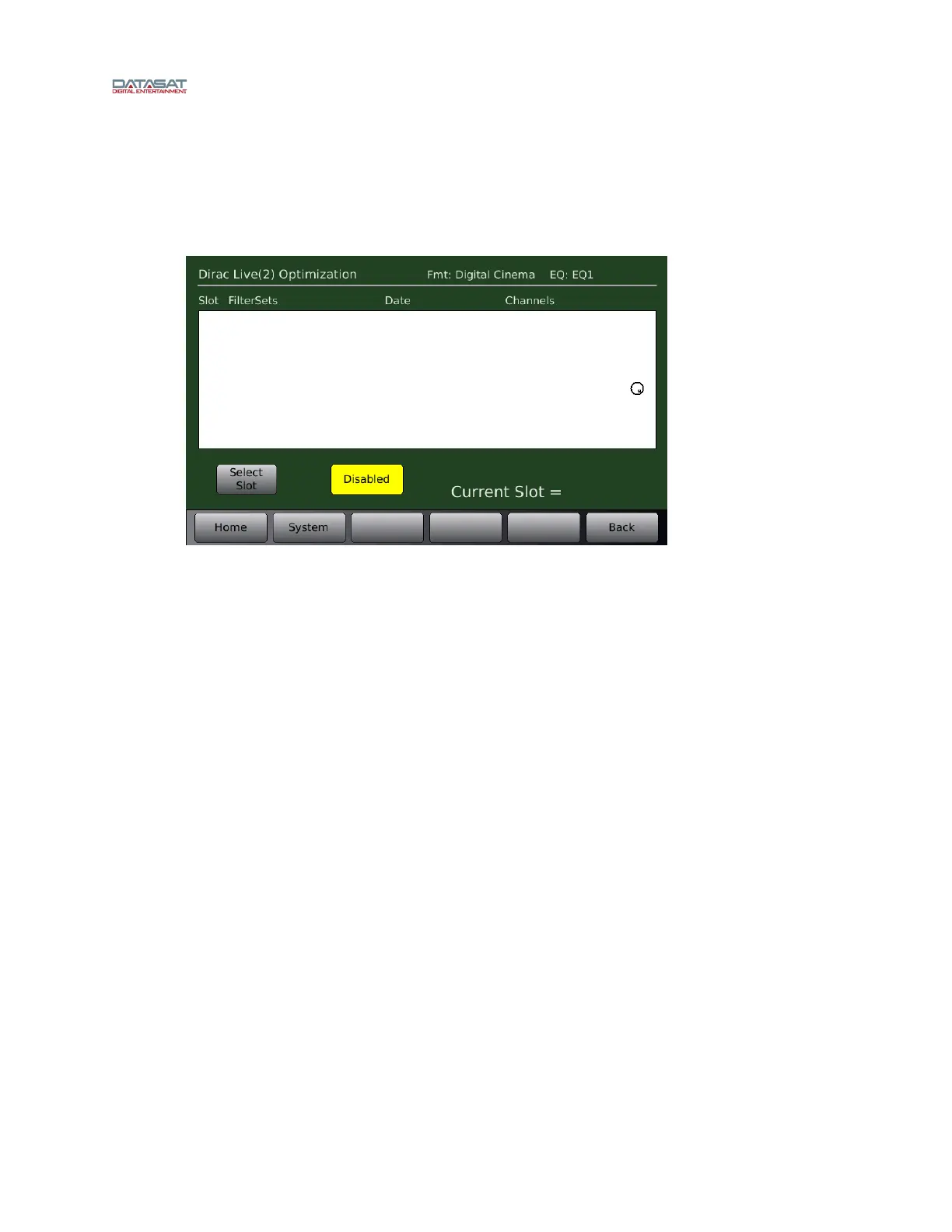 Dirac Live Optimization Enabled/Disabled – Touching the button will toggle between