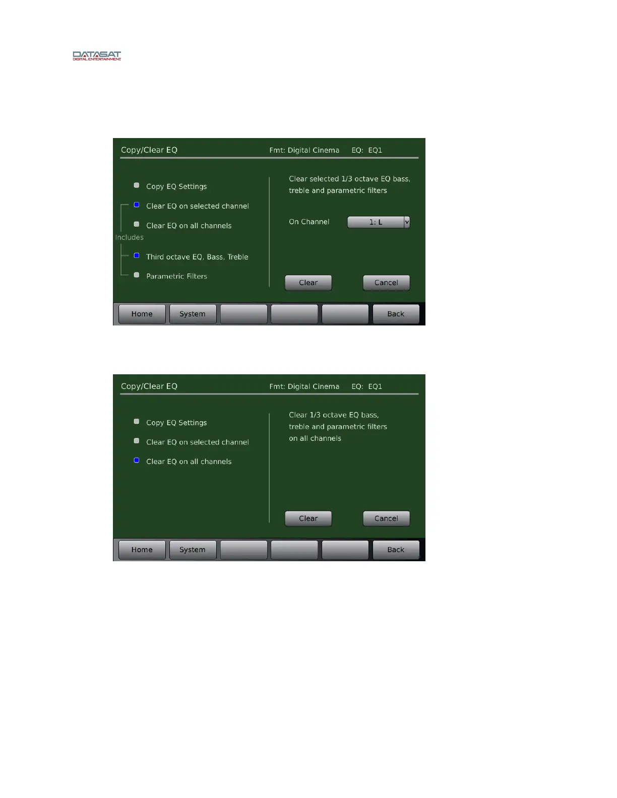 Clear EQ on all channels clears third octave, bass, treble and parametric filters on all