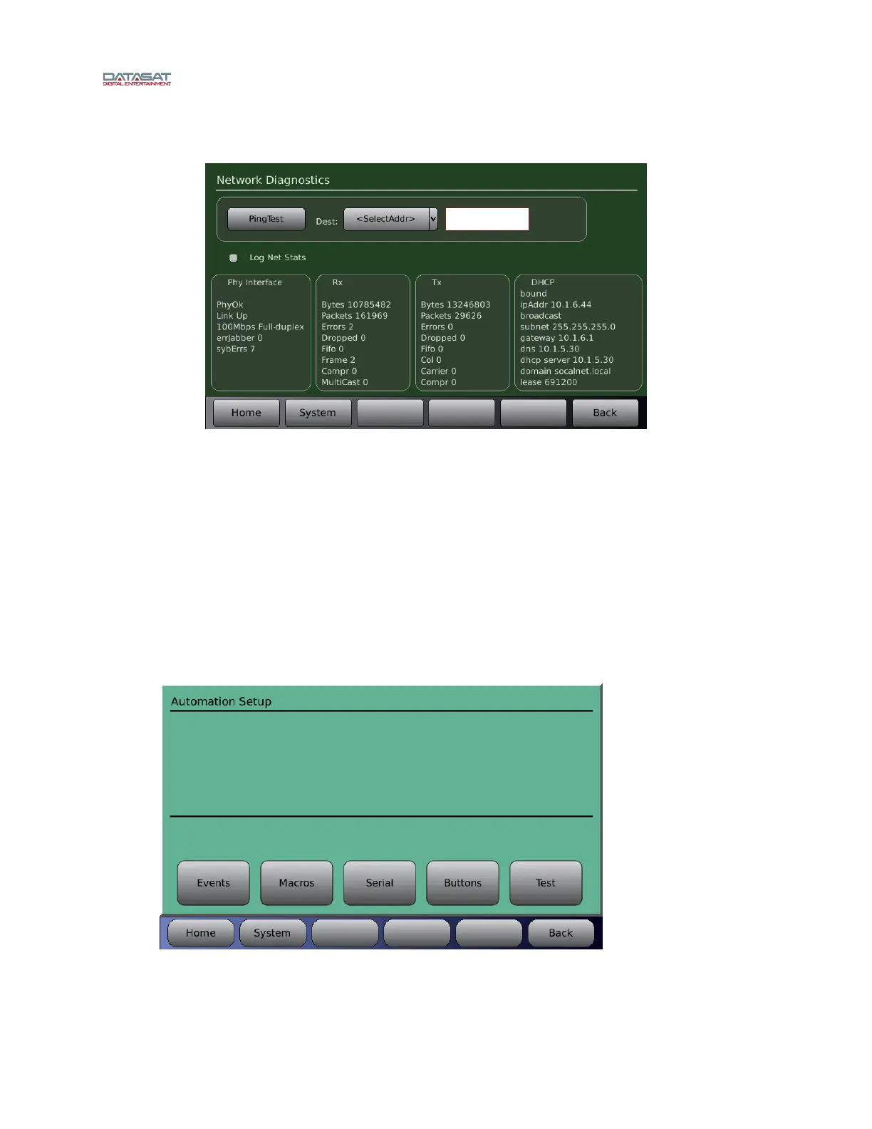 The Network Diagnostics screen shows current network statistics, and may be used for testing