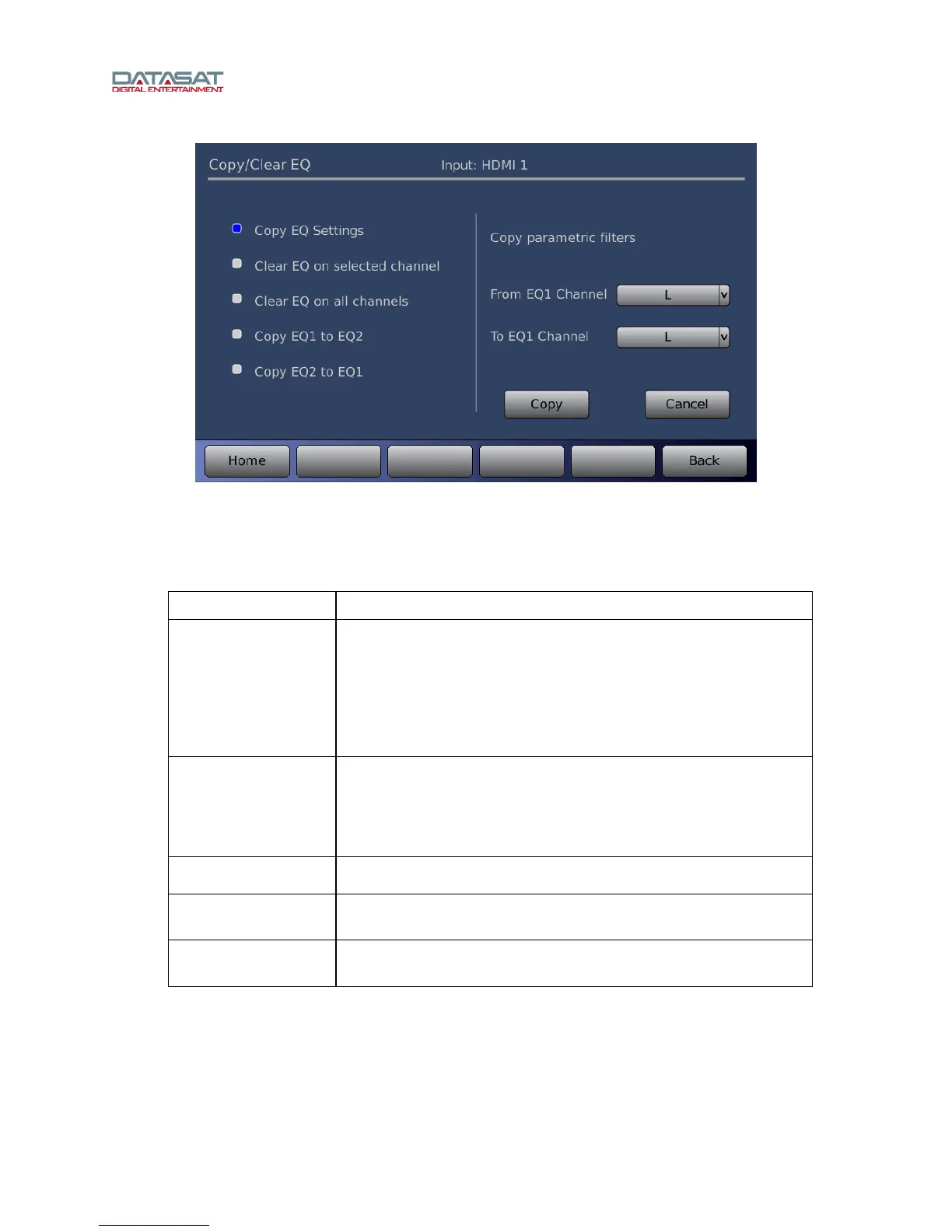 This screen is used to copy or clear the EQ settings for one or all channels.