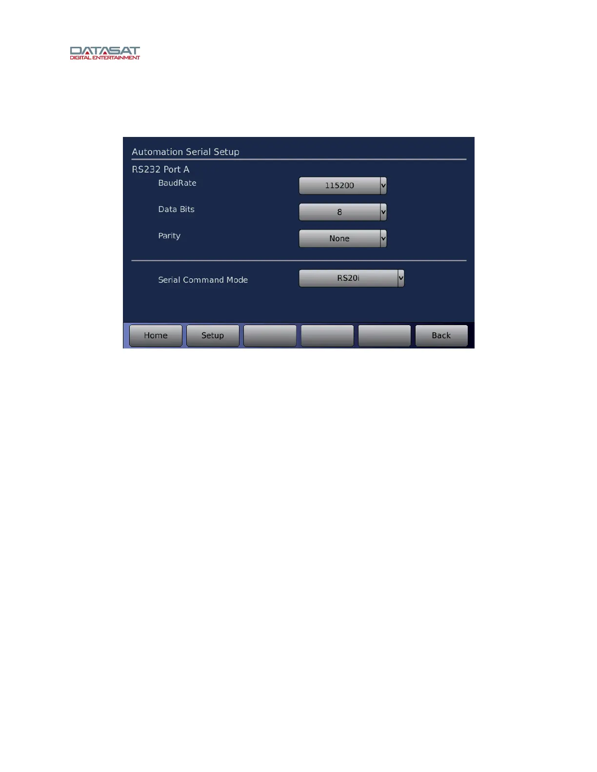 Use this screen to set up the RS232 serial port on the RS20i rear panel.