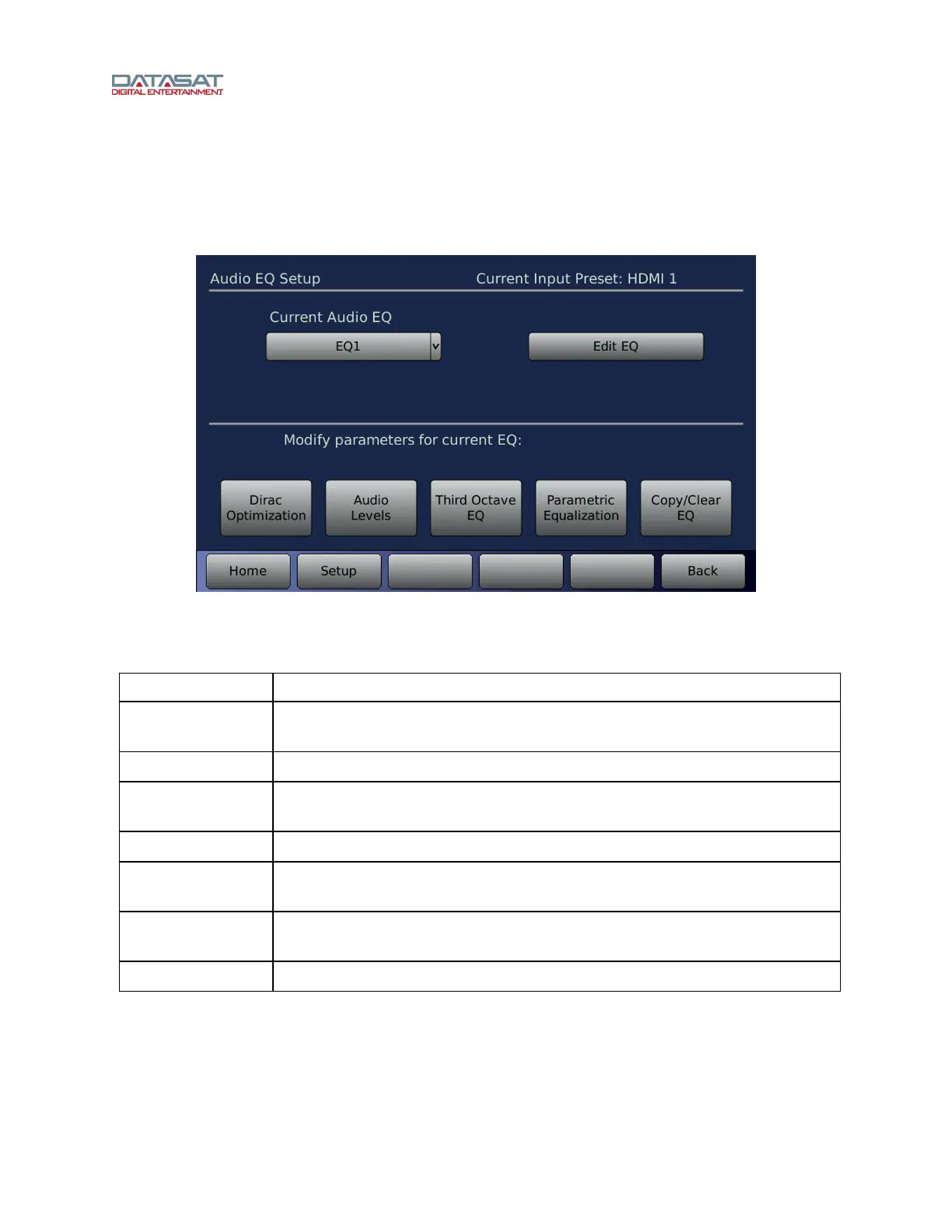 The Audio EQ Setup screen allows you to set the Audio EQ for the current Input Preset and edit the EQ.