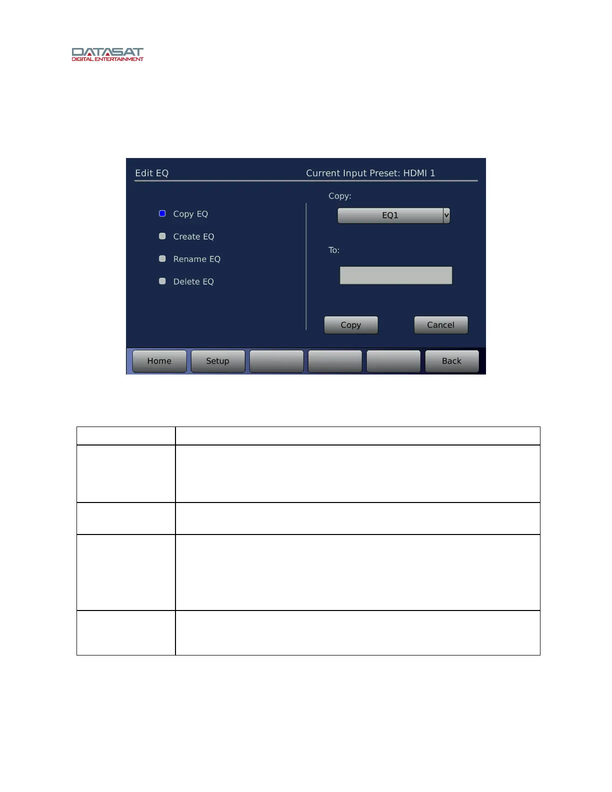 The Edit EQs button on the Audio EQ Setup screen opens the Edit EQ screen to Copy, Create, Rename