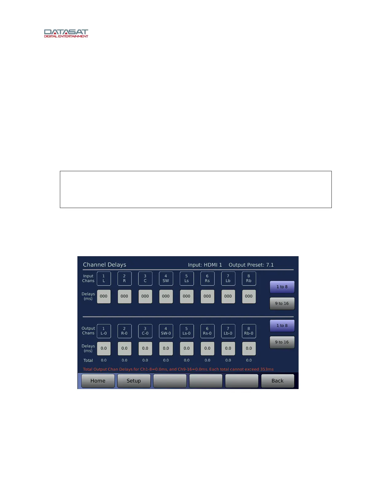 between channels 1 to 8 or channels 9 to 16. The lower portion sets delays for Output Channels. The