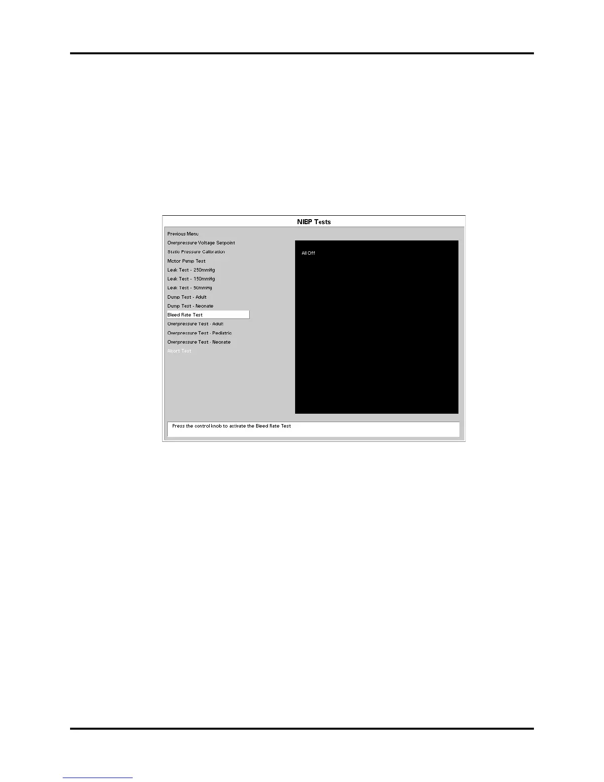 2. Rotate the control knob to highlight the bleed rate. Once the bleed rate test is