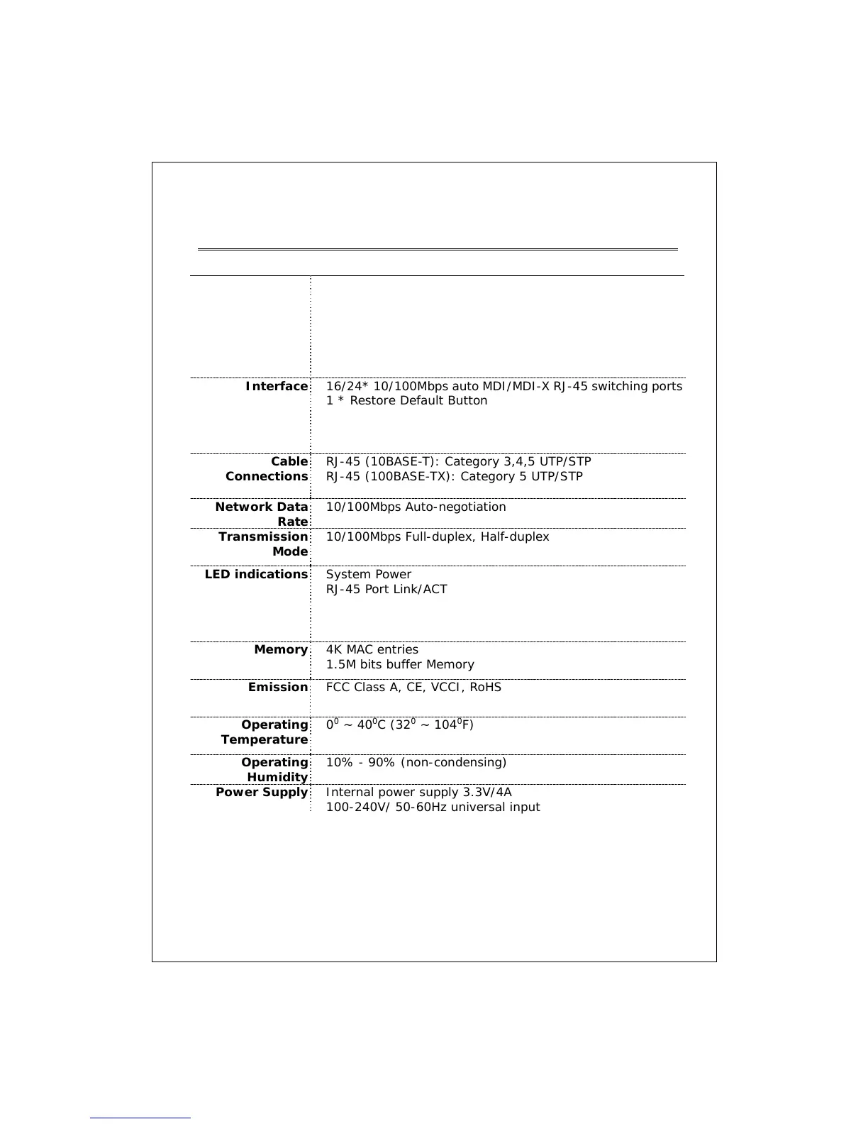 16/24* 10/100Mbps auto MDI/MDI-X RJ-45 switching ports