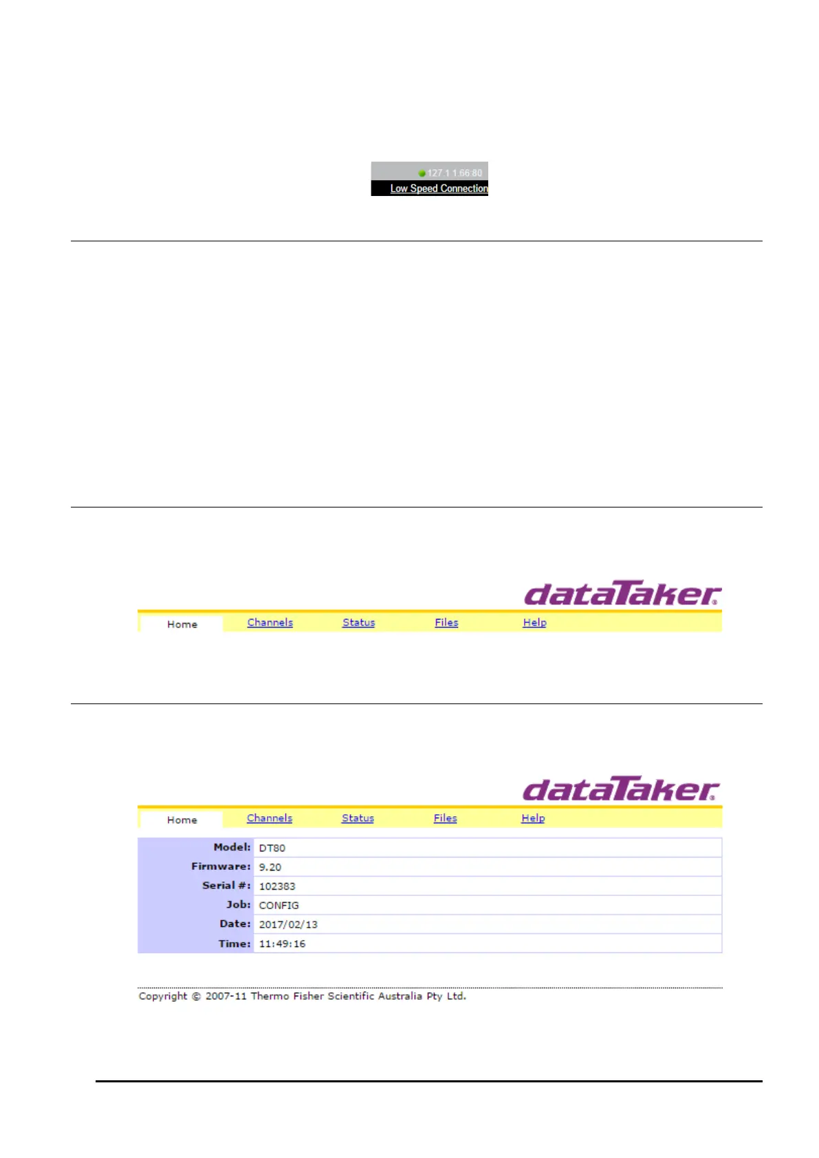 The Home page displays the data logger’s model, firmware version, serial number, the current job name and the current